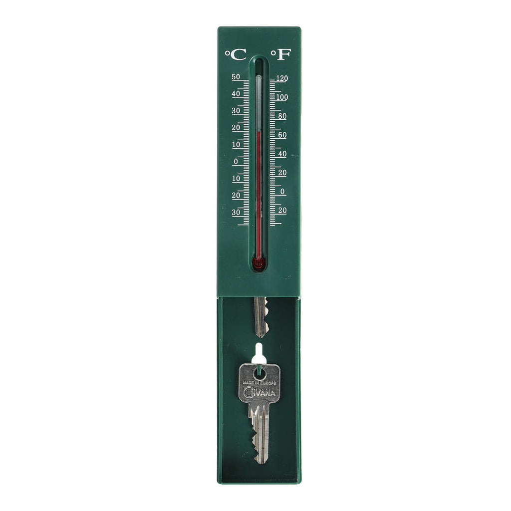 Deze muurthermometer heeft een geheim, de voorkant kan naar boven worden geschoven waardoor twee haken zichtbaar worden die een ideale verstopplaats voor sleutels bieden. De thermometer laat zowel de temperatuur in Celsius (van -30 tot +50) als in Fahrenh