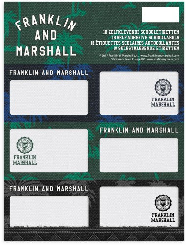 Etiketten van Franklin Marshall Boys. Plak de etiketten op je gekafte schoolboeken, op een schrift of ergens anders op waarvan je denkt dat het handig is. De etiketten zijn voorzien van een leuke print en voldoende ruimte om op te schrijven. Een set bevat achttien etiketten en is geschikt voor kinderen vanaf vier jarige leeftijd.