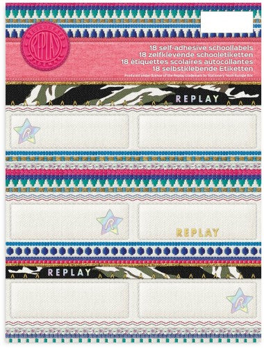 Etiketten van Replay Fashion. Plak de etiketten op je gekafte schoolboeken, op een schrift of ergens anders op waarvan je denkt dat het handig is. De etiketten zijn voorzien van een leuke print en voldoende ruimte om op te schrijven. Een set bevat achttien etiketten en is geschikt voor kinderen vanaf vier jarige leeftijd.