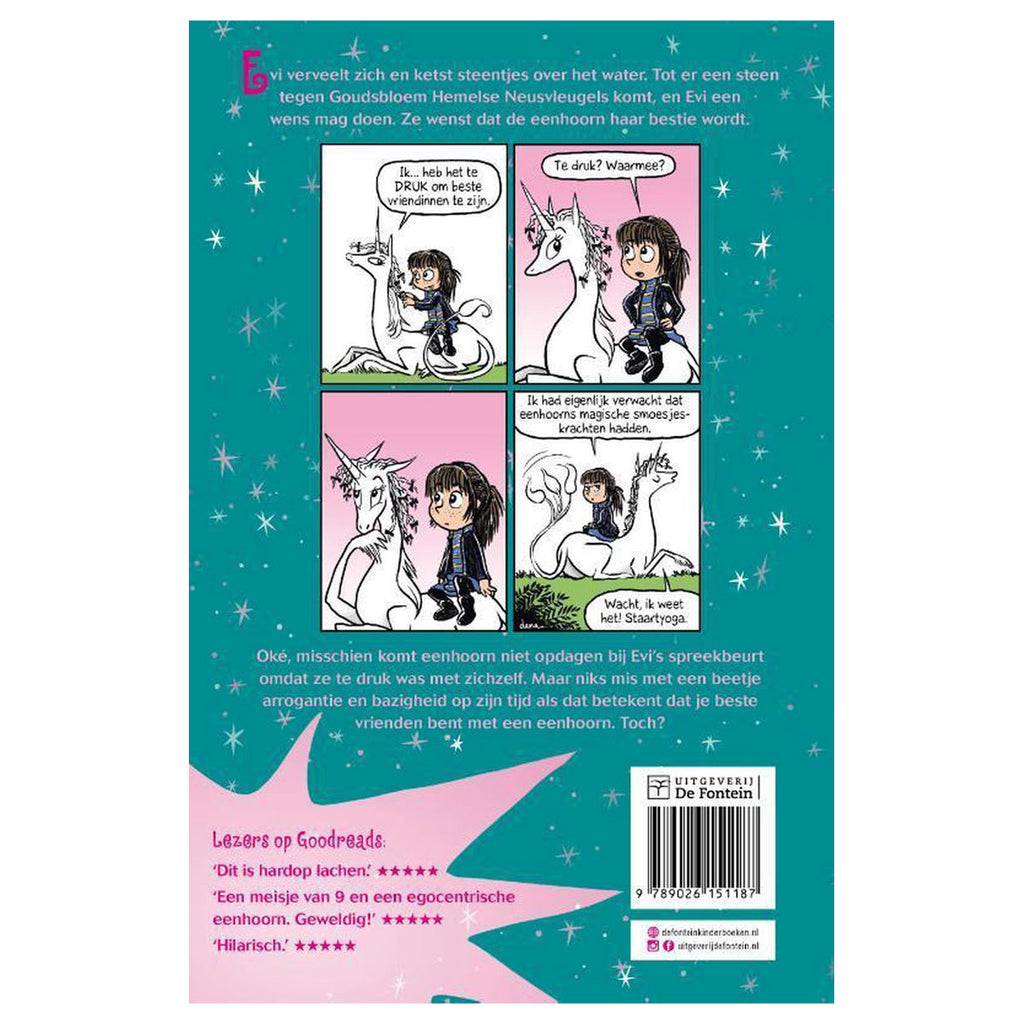 Evi verveelt zich en ketst steentjes over het water. Tot er een steen tegen een eenhoorn ketst. En Evi een wens mag doen. En ze wenst dat de eenhoorn in kwestie haar bestie wordt. Dus laveert Evi nu door alle basisschoolproblemen met een eenhoorn aan haar zijde. Niks mis met een beetje narcisme en hooghartigheid op zijn tijd als dat betekent dat je beste vrienden bent met een eenhoorn. Toch?
