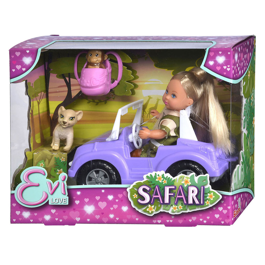Evi Love minipop op safari. Inhoud: 1 Evi pop, 1 auto, 1 welpje, 1 aap, 1 rugzak en 1 verrekijker. Geschikt vanaf 3 jaar.