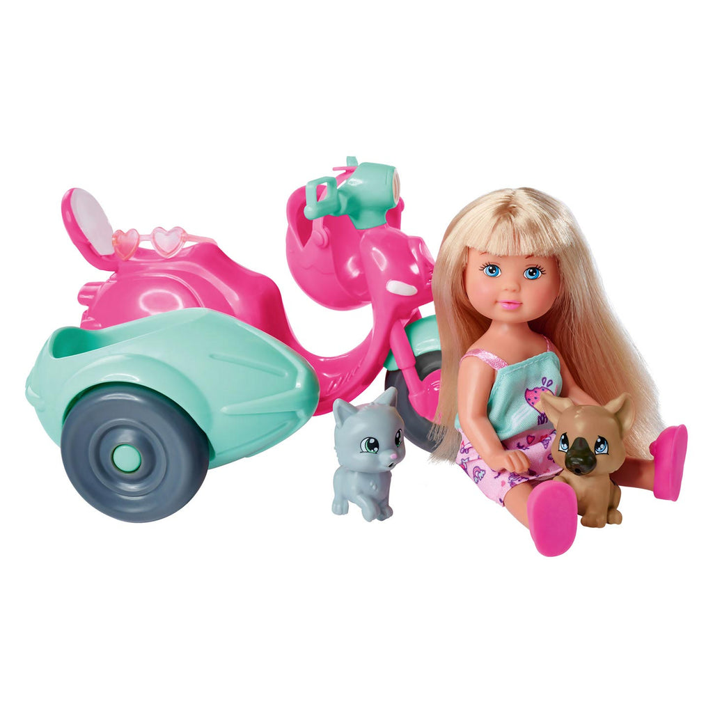 Speelfiguur van Evi Love met een scooter met zijspan, twee huisdieren, een helm en een zonnebril. Het Evi-popje is ongeveer 12 centimeter groot. Geschikt vanaf 3 jaar.