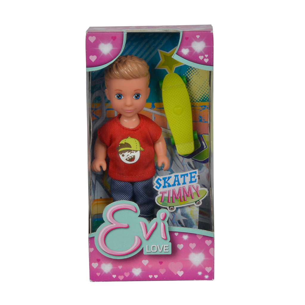 Speel met Skater Timmy, het favoriete vriendje van Evi Love. Zet Timmy op z’n skateboard en doe de gaafste stunts! Timmy draagt een blauwe broek, hippe witte sneakers en een stoer rood shirt.
