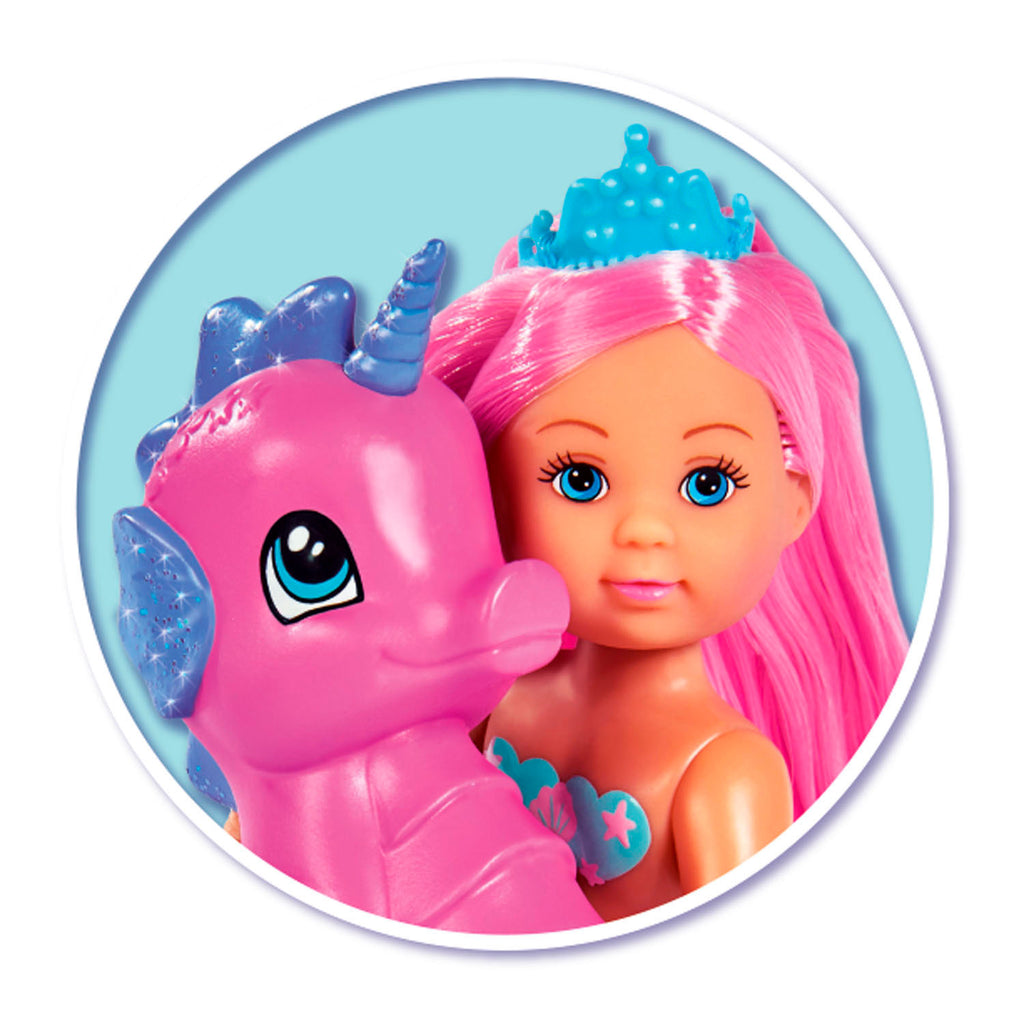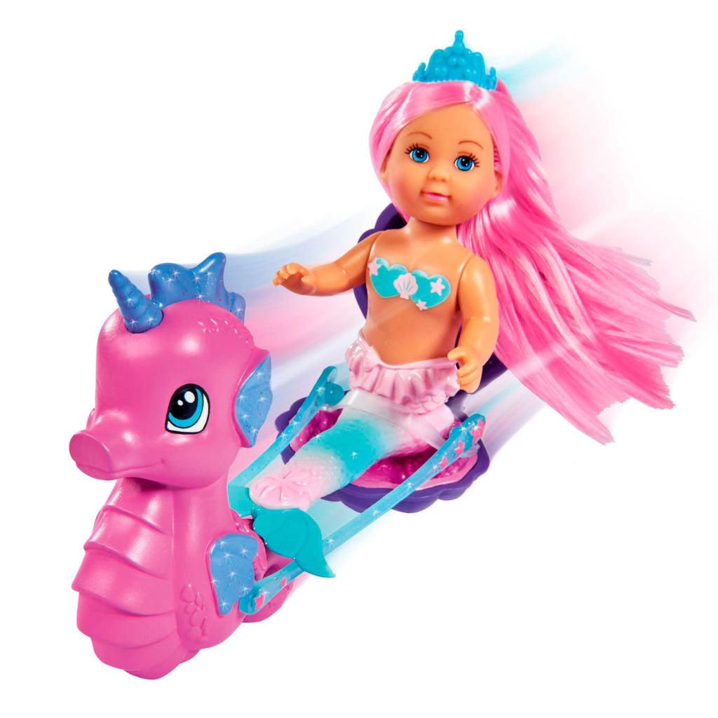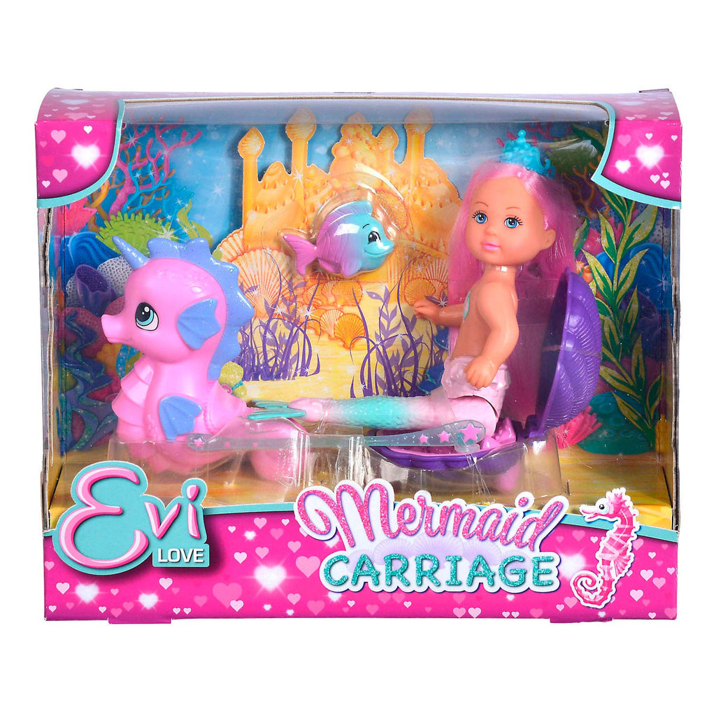 Evi de zeemeermin wordt voortgetrokken in een koets van een schelp met een zeepaardje wat de koets trekt! Het visje is nieuwsgierig en volgt hen overal.