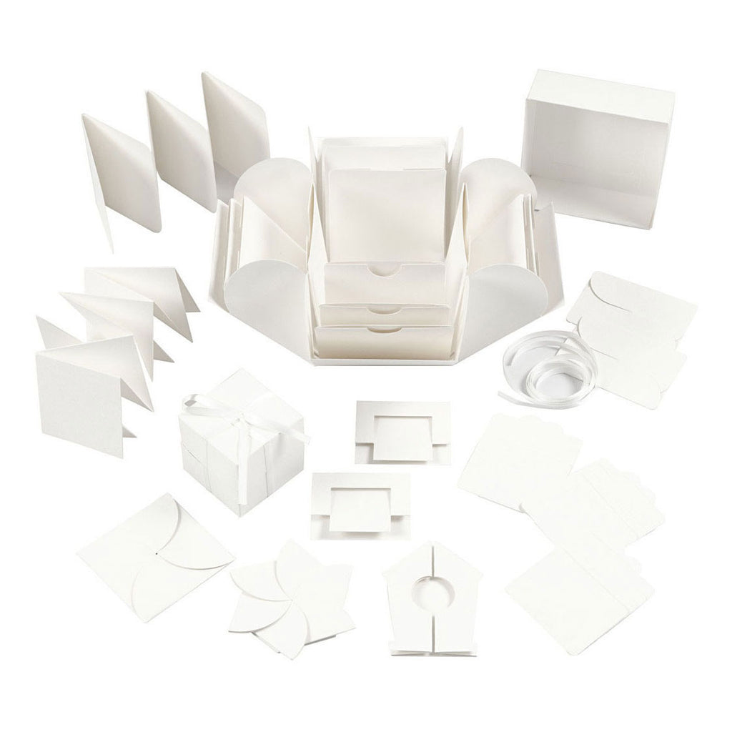 Geschenkdoos van stevig karton, dat bij opening 'explodeert' in verschillende lagen en compartimenten. De meegeleverde decoraties kun je decoreren met persoonlijke berichten, afbeeldingen, foto's enz. De box is een kaart en een cadeau in één!