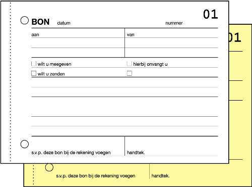 2x 50 vel, genummerd met carbon - formaat: A6 dwars - bevat alle belangrijke gegevens die voor het kwiteren noodzakelijk zijn, bijv. bij goederenontvangst en -uitgave - makkelijk en snel in te vullen - doorlopende nummers voorgedrukt op het origineel en de kopie - doorslagen in kleur voor een goede organisatie - 1e en 2e blad bedrukt - 1e en 2e blad met 2-gaats perforatie - uitscheurbaar door microperforatie-ringband