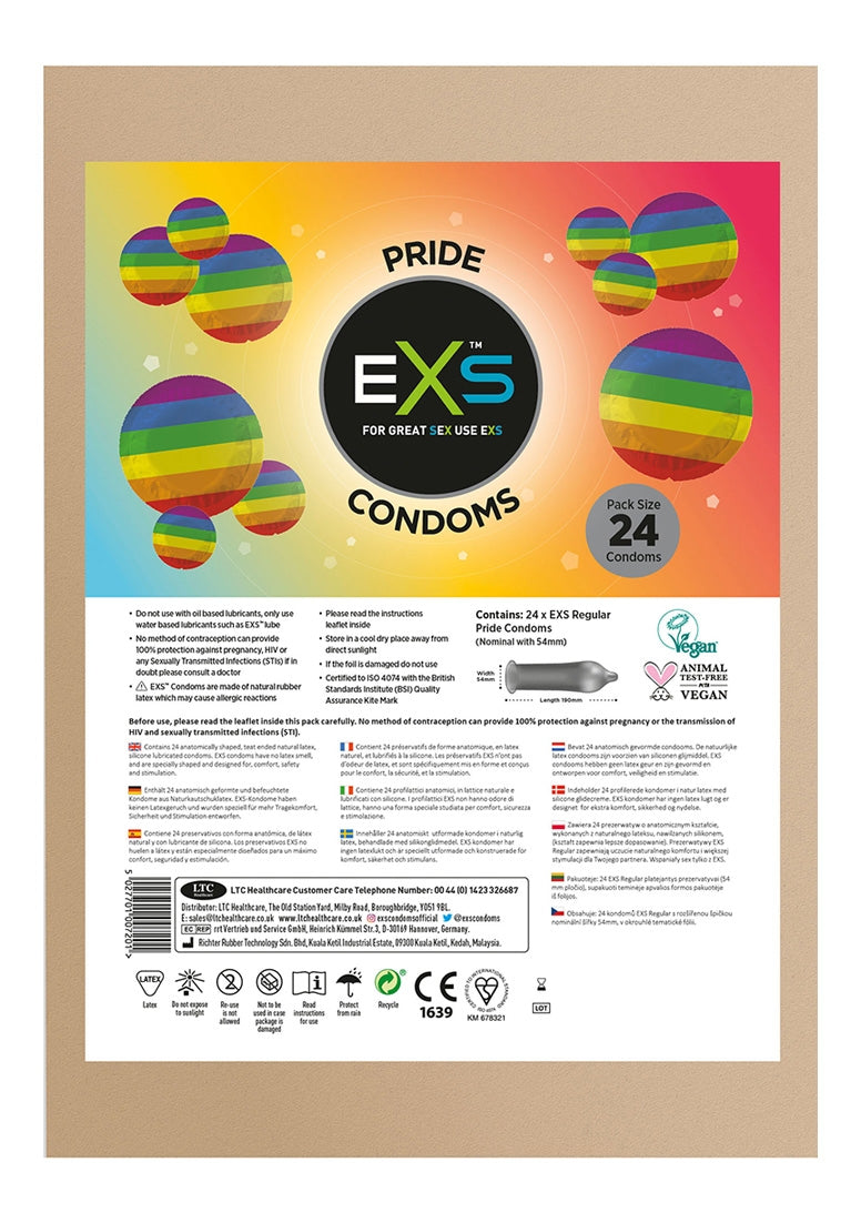 EXS Pride Rainbow pack of 24 condoms - Can fit through a letter box! - 56mm width flare and teat ended for extra comfort
