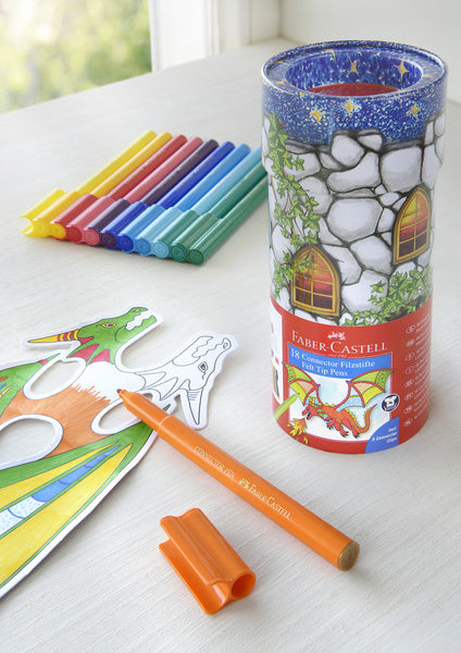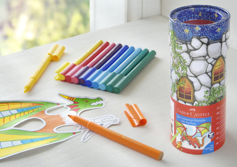 Connector stiften bieden veel mogelijkheden wat betreft het kleuren, knutselen en het opruimen. Vilten stiften met heldere, intense kleuren. Inkt op waterbasis. Uitwasbaar uit de meeste stoffen. Ideaal te combineren met Connector waterverf. De stiften hebben een drukbestendige punt en is ideaal voor kleine handjes. Koker met 18 stiften, 5 clips en tekenkaarten met draakmotief.