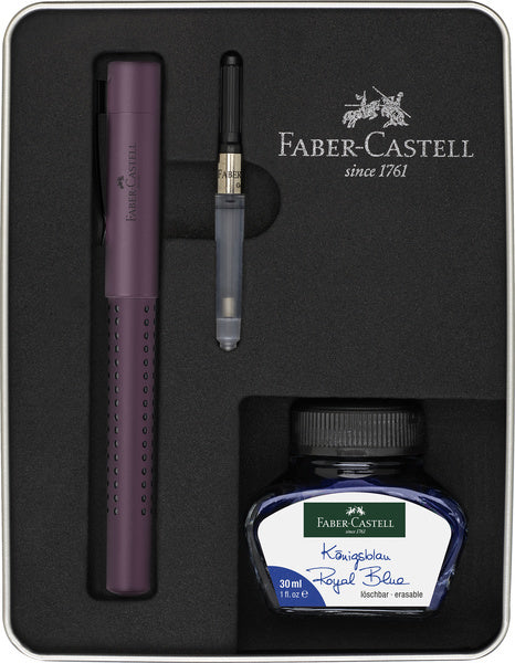 Gift box met vulpen Grip M. Inkpotje 30ml (blauw uitwisbaar) en convertor. De vulpen heeft een ergonomisch zacht rubberen gripzone die zorgt voor urenlang onvermoeid schrijven. De vulpen is voor zowel links- als rechtshandigen en voorzien van een clip en stevige penpunt. De convertor wordt gebruikt voor het hervullen van een inktpatroon met de bijgeleverde vloeibare inkt. Deze set wordt geleverd in metalen bliketui. Kleur pen: Berry.