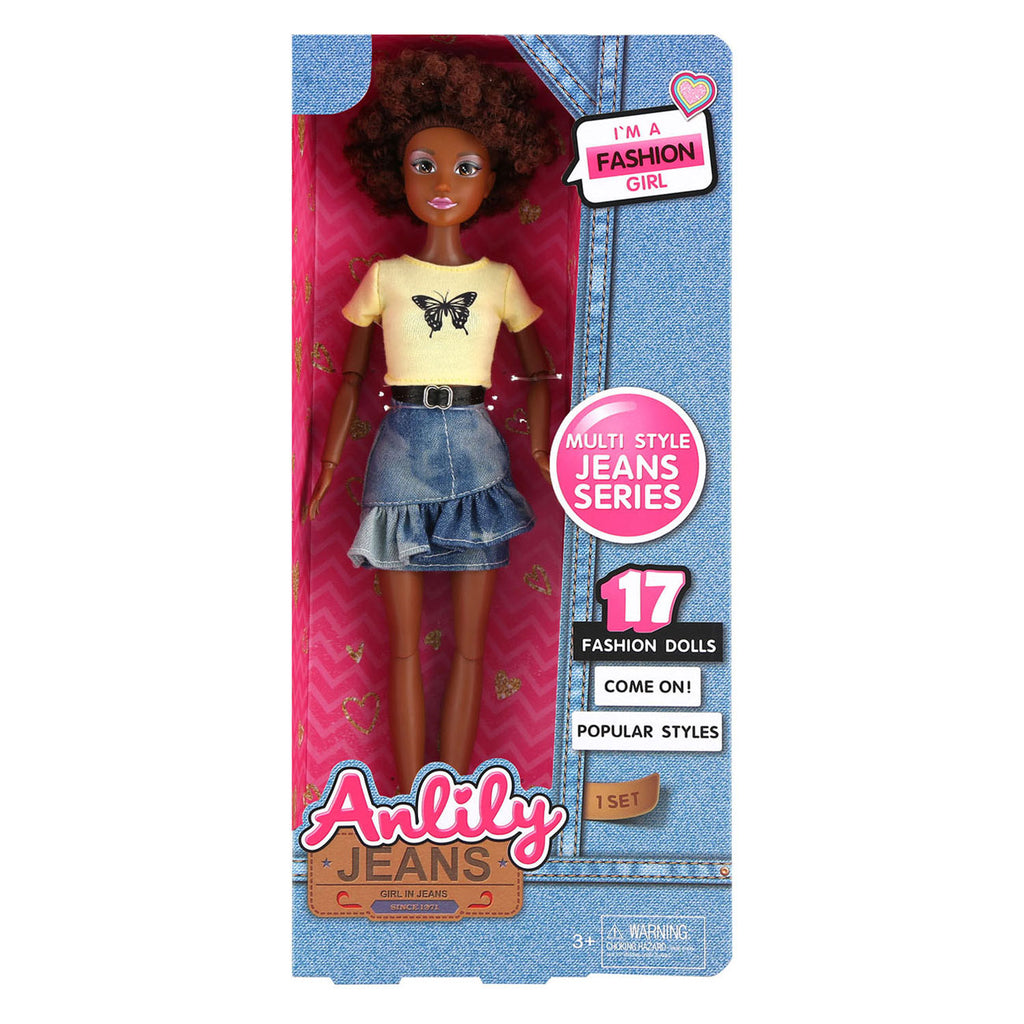 Fashion Doll Modepop Spring Time Jeans met buigbare armen en benen. De pop draagt een lenteachtig shirtje met een vlinder erop en een korte spijkerrok. Geschikt voor kinderen van 3 jaar en ouder.