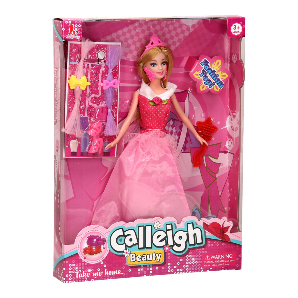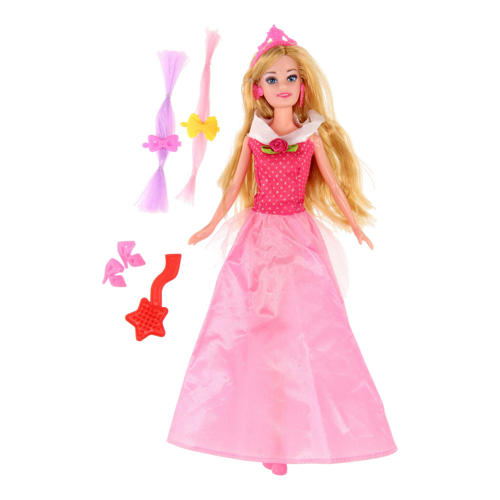 Als een ware diva, zo ziet deze Fashion Pop met Accessoires eruit! Haar lange roze jurk met glanzende stippen en een roosje is adembenemend. Met de bijgeleverde accessoires maak je haar nog mooier: een roze kroontje, hakschoentjes, oorbellen, een borstel, paarse en roze pluk met speldje voor in haar haren! Laat je betoveren door jouw Fashion Pop met Accessoires!