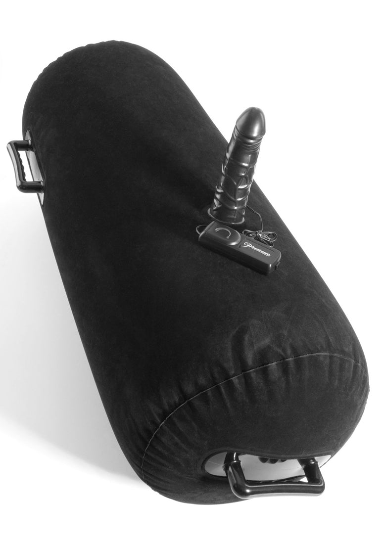 Opblaasbaar, lang zitkussen met geïntegreerde vibrator in duidelijk geaderde penis-look. 3 stevige handgrepen zorgen voor een veilige houvast tijdens het gevarieerde rijplezier. De multispeed vibratie is traploos regelbaar van zacht tot hevig met de bedrade bediening. Het zitkussen heeft een schoonveegbare, huidvriendelijke fluweel-look flocking. (Gelieve batterijen afzonderlijk te bestellen: 2 x AA)