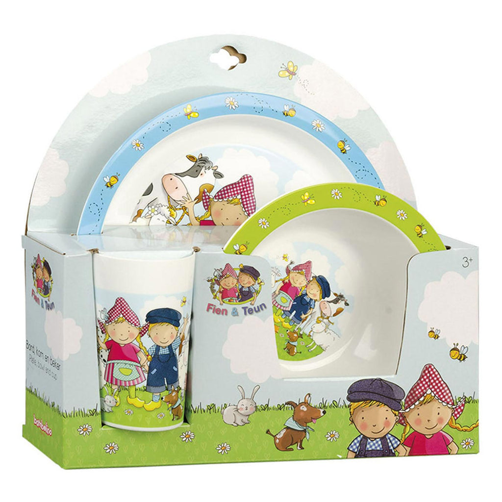 Wil jij helemaal in Fien en Teun stijl eten. Dat kan. Met de Fien en Teun kinder eetset zullen jouw maaltijden nog lekkerder smaken. De set bestaat uit een bekertje, een bordje en een schaaltje. De eetset is gemaakt van plastic en kan in de vaatwasser. Het bord en het schaaltje kunnen in de magnetron.