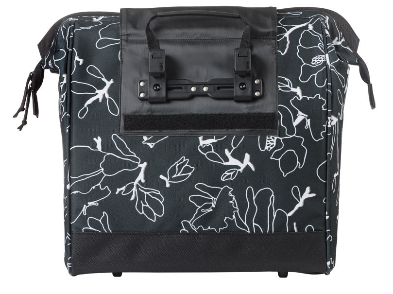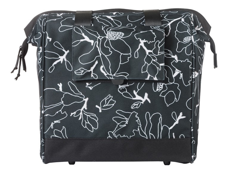 Met de Basil Grand fietsshopper wordt boodschappen of andere inkopen doen een feestje. Hij ziet er namelijk stijlvol en luxe uit, mede dankzij de zwarte kleur en de fleurige bloemenprint. Bovendien is hij gemaakt van waterafstotend 600D polyester en beschikt de shopper over een groot hoofdvak inclusief een gepolsterd (laptop)vak. Handig voor je studie aan de universiteit of voor je kantoorwerk. Met 23 liter inhoud kan je er dan ook de nodige boodschappen of andere spullen in kwijt. De tas is vormvast en dankzij de grootte kun je er met gemak pakken drinken staand in kwijt. De Basil Grand fietsshopper heeft een zogenaamde dokterssluiting, een extra grote opening zodat je de ruimte hebt voor het inpakken van de shopper. Je bevestigt de shopper aan je fiets met MIK Hooks. Tip: ga je fietsen? Zet dan de handgrepen vast met het lusje aan het logo. Zo voorkom je dat de handgrepen gaan wapperen. Kenmerken: Inhoud: 23 liter Kleur: zwart met bloemenprint Materiaal: waterafstotend 600D polyester Groot hoofdvak met gepolsterd laptopvak Vormvast ontwerp; geschikt voor staande drinkpakken Dokterssluiting voor extra grote opening Bevestiging met MIK Hooks Afneembare schouderband en vegan lederen handgrepen Handgreeplus om wapperen tijdens het fietsen te voorkomen
