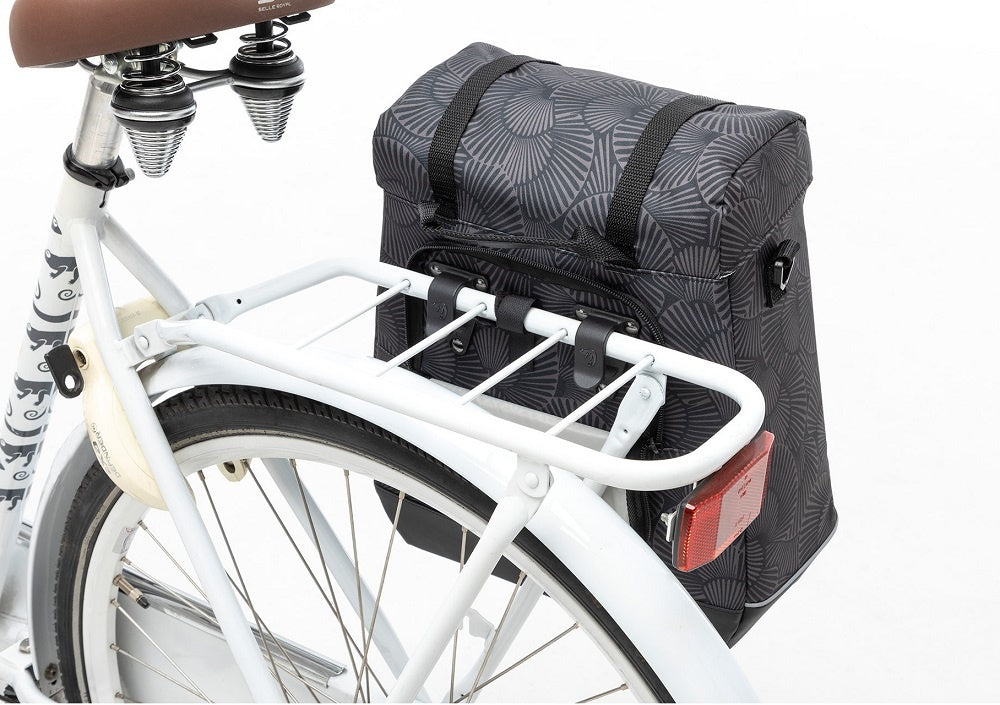 De Alba Single is een schoudertas met verstelbare band, drukknopen en een ruim hoofdvak voor onder andere boodschappen en mappen. De fietshaken dek je na gebruik af met een speciaal ritsvak. Eigenschappen: Schoudertas gemaakt van waterafstotend polyester Sluiting d.m.v. drukknopen Hoofdvak & extra voorvak met rits Verstelbare en afneembare schouderband Fietshaken in ritsvak Reflectie aan beide zijden Product Specificaties: Materiaal: Waterafstotend polyester Kleuren: Selo Black Afmeting: 32 x 35 x 16 cm Inhoud: 17 liter Gewicht: 0,94 kg Bevestiging: New Looxs haken
