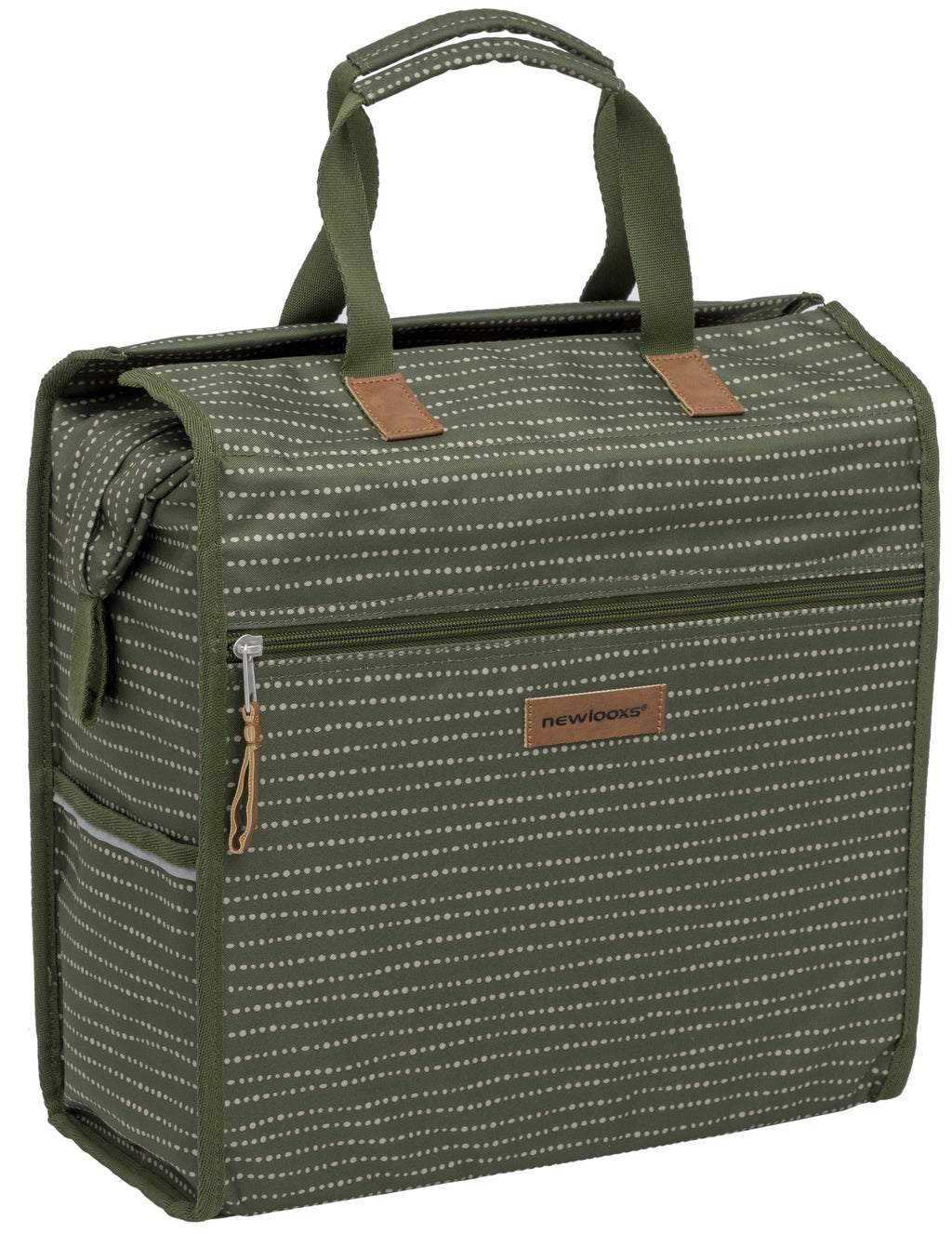 De Lilly is een handige boodschappentas, gemaakt van waterafstotend polyester. De fietstas heeft een ruim hoofdvak en 3 kleinere voorvakken. De haken zitten netjes weggewerkt in een ritsvak en door het reflecterende logo ben je ook in het donker goed zichtbaar. Eigenschappen: Boodschappentas gemaakt van waterafstotend polyester 1 extra ritsvak 2 extra buitenvakken Afdekbare haken voor bevestiging op bagagedrager Reflectielogo Specificaties: Materiaal: Waterafstotend polyester Inhoud: 18 liter Kleuren: Nomi Green Gewicht: 1,13 kg Afmeting: 35 x 32 x 16 cm Bevestiging: New Looxs haken