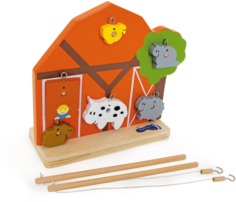 Wie vangt als eerste alle boerderijdieren? In dit staande visspel van hout met twee hengels en 12 figuurtjes gaat het erom wie de concurrentie gaat verslaan. Wie lukt het om de koe te vissen?