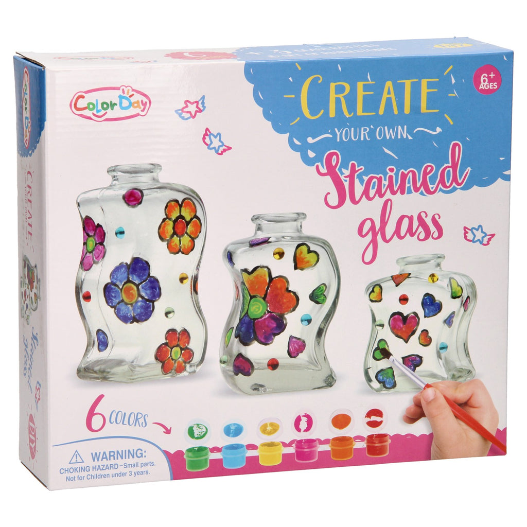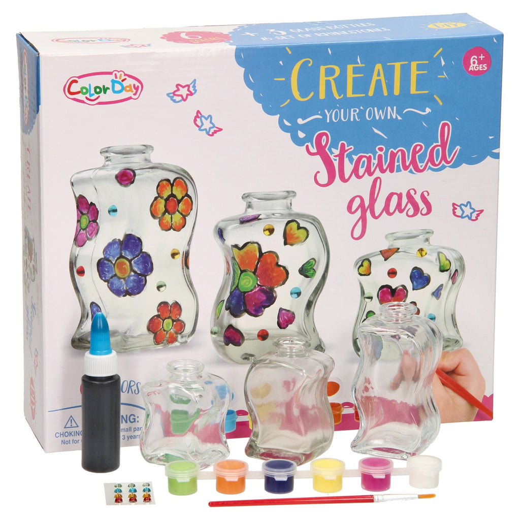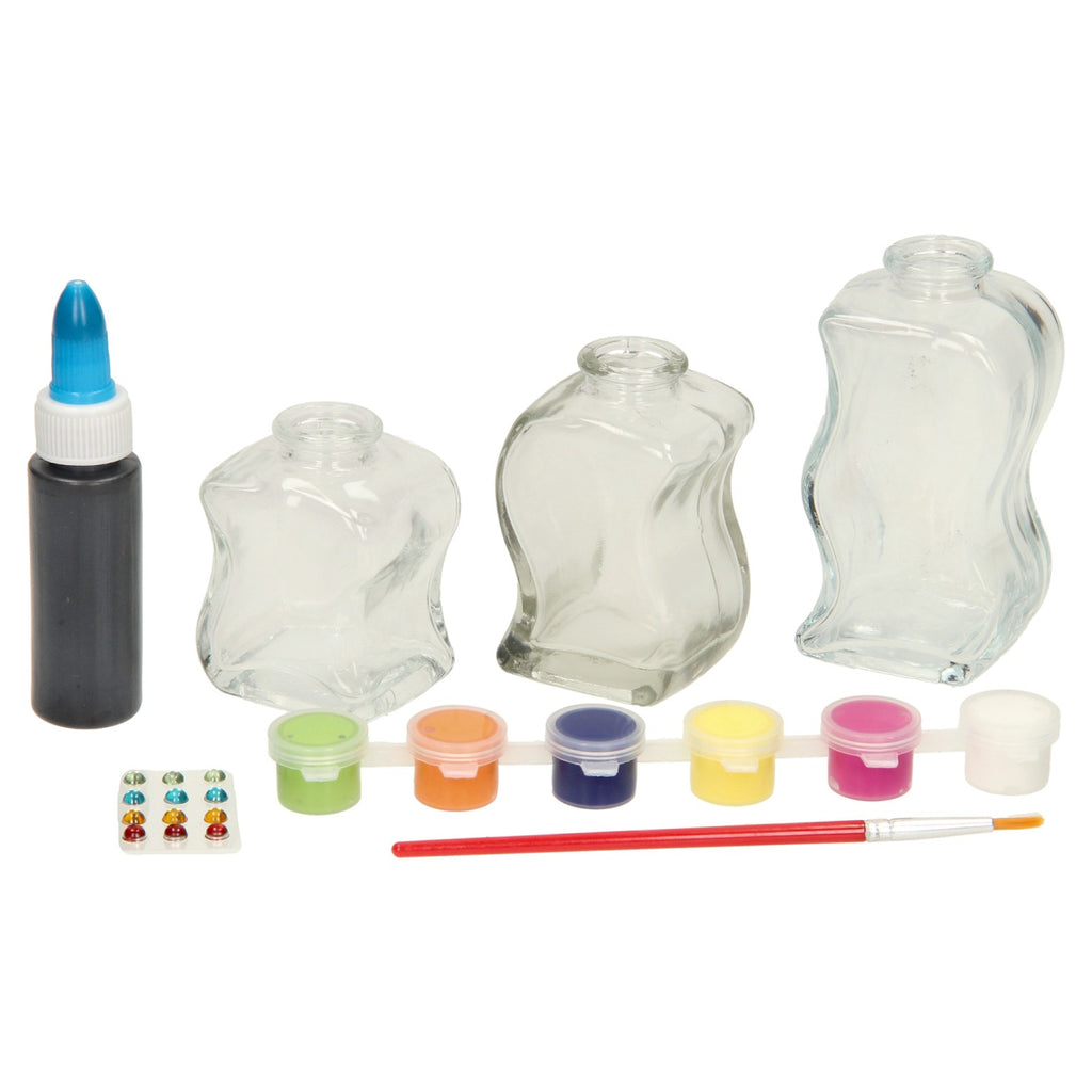 Maak je eigen glas-in-lood flesjes met deze knutselset. Laat je creativiteit de vrije loop en versier de drie verschillende flesjes met verf, reliëf pasta en steentjes. Als de flesjes af zijn kun je ze bijvoorbeeld gebruiken voor je eigen geplukte bloemen! Geschikt vanaf zes jaar.