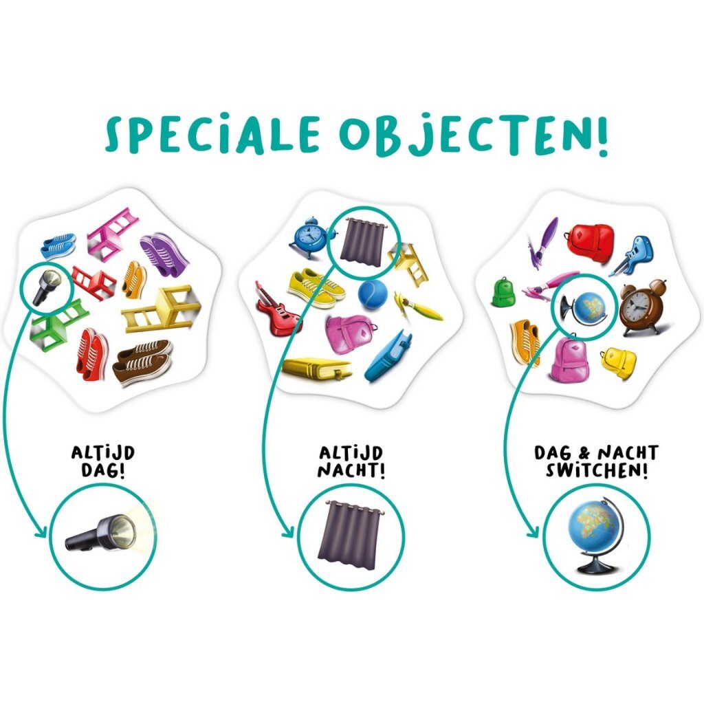 Elke kaart die wordt omgedraaid, verandert de omstandigheden om een correcte oplossing te vinden. Maar let op, speciale voorwerpen ‘switchen’ alles nog meer om! Als deze verschijnen, veranderen ze de invloed van dag- en nachtkaarten.