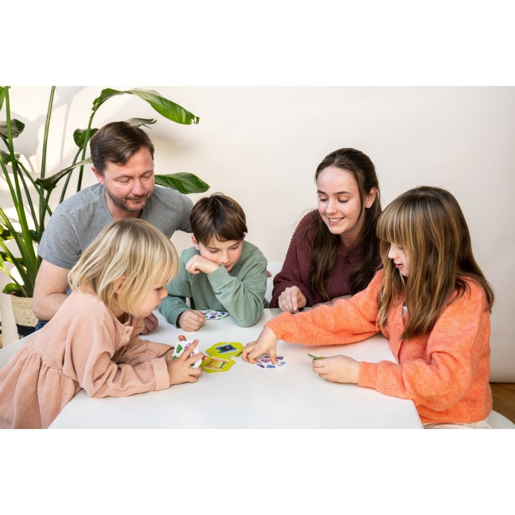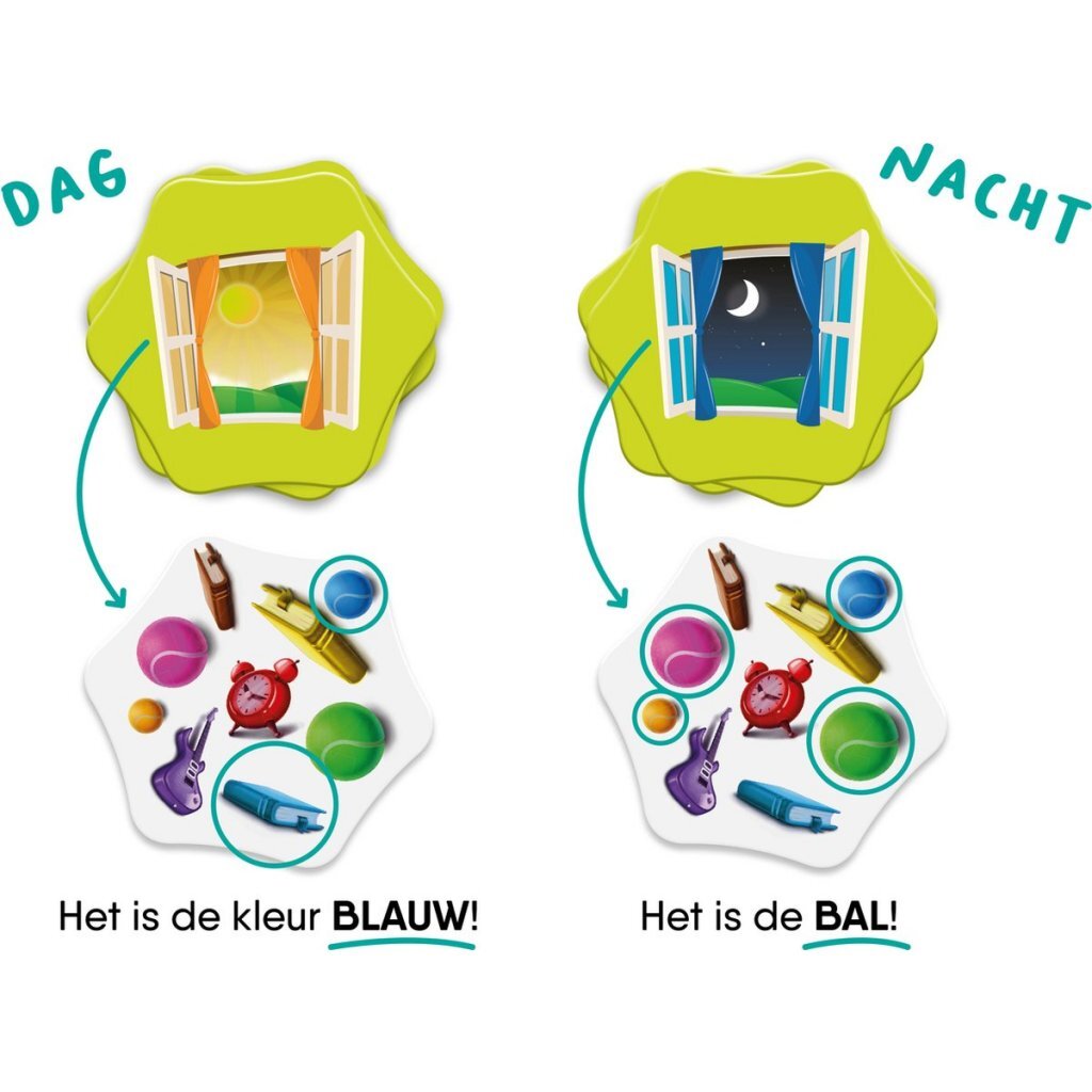Draai een kaart om, doorzoek de rommelige kamer en probeer als eerste de kleur of het figuur te vinden die het meest voorkomt.