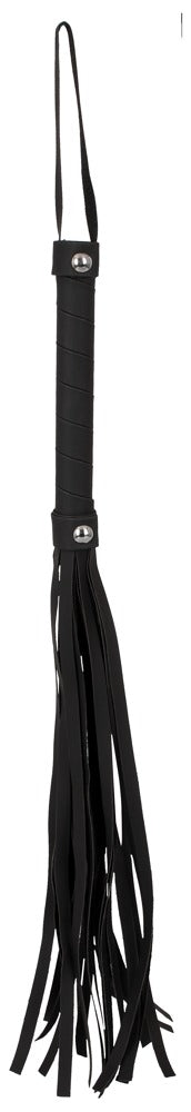 Voor tedere en pijnlijke liefdesslagen! Zwarte zweep/vlogger met omwikkeld handvat en praktische ophang-/vasthoudlus. Hij ligt stevig en evenwichtig in de hand zodat je hem met de zachte bandjes kunt strelen of met plezier kunt slaan. Gemaakt van hoogwaardig imitatieleer (polyurethaan).