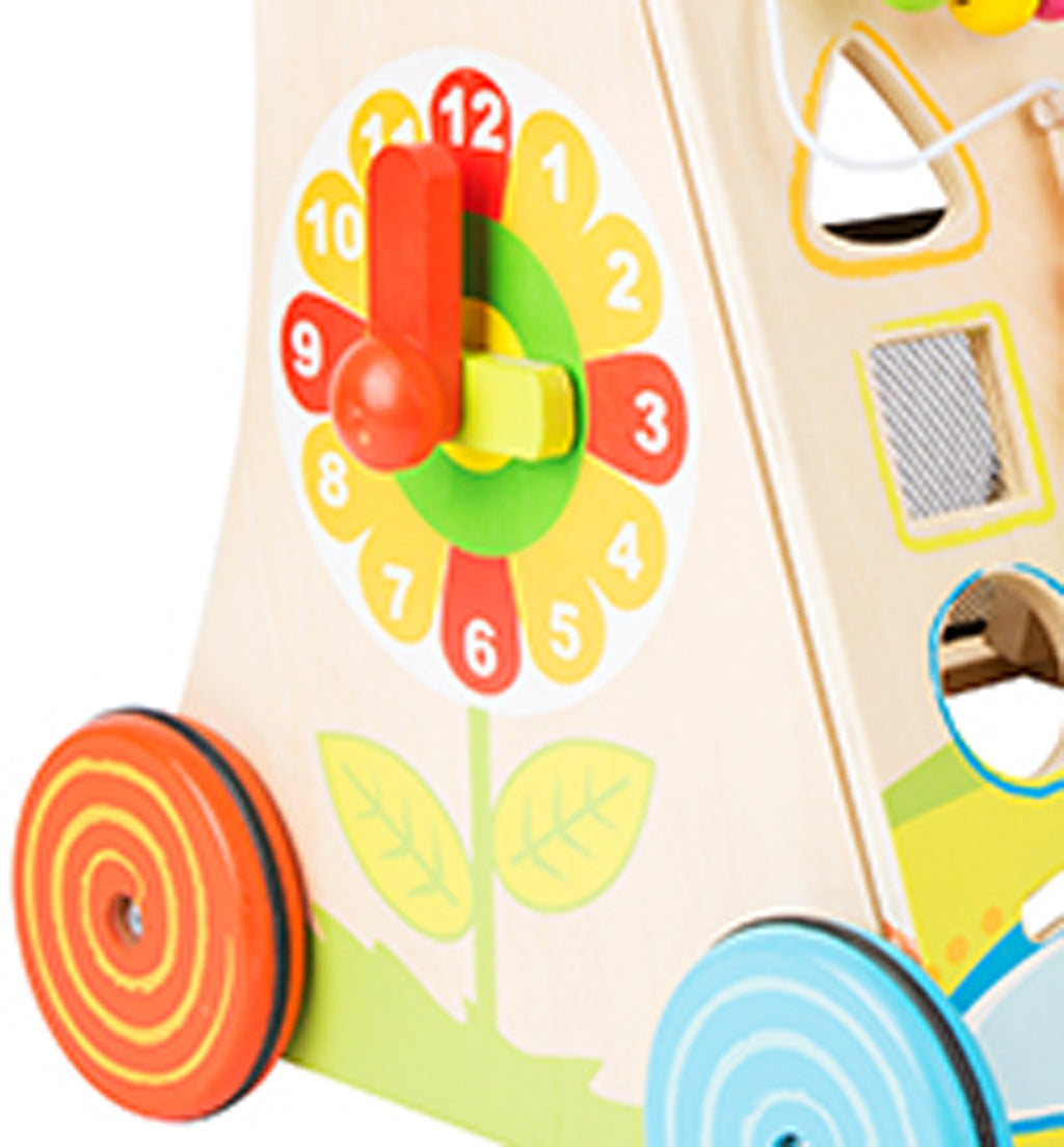 Actief op alle niveaus! Deze stabiele loopwagen biedt alles wat jonge ontdekkingsreizigers nodig hebben om hun wereld met alle zintuigen te ontdekken. Een xylofoon met 5 sleutels, meerdere duwspellen, een kralenachtbaan met kleurrijke kralen, tandwielen en een vormpasspel met een net om de stukjes te vangen (dat ook kan worden gebruikt om iemands favoriete teddybeer onderweg op te bergen) zijn allemaal inbegrepen. De wielen met hun rubberen ringen voorkomen wegglijden en verminderen het geluid van de wielen op vloeren. Op deze wandeltrainer valt altijd iets nieuws te ontdekken met alle zintuigen!