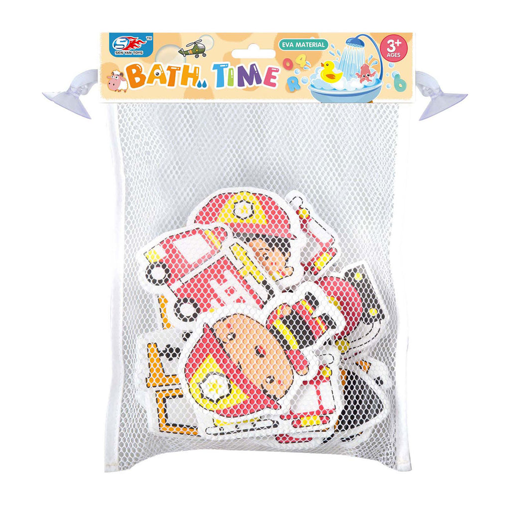 Set foam badfiguren met brandweer- en bouwvoertuigen, gemaakt van EVA-schuim. Inclusief opbergnetje met zuignappen. Geschikt vanaf 3 jaar.