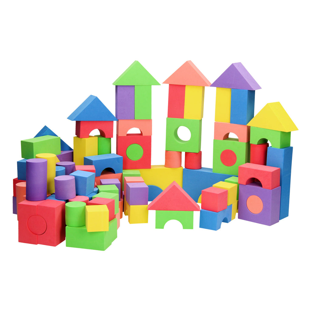 Verschillende vormen en kleuren bouwblokken van foam om mooie bouwwerken mee te maken. Inhoud: 100 blokken.