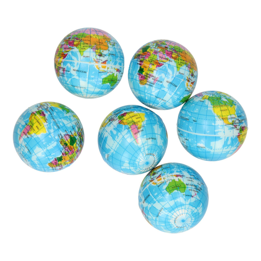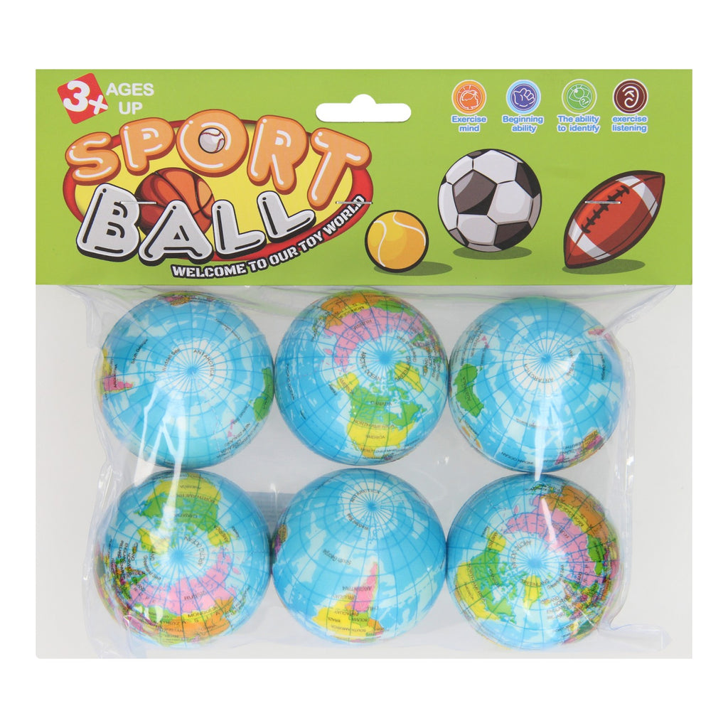 Zes foamballen met de wereldbol afgebeeld op elke bal. Foamballen zijn zacht en daardoor veilig in gebruik. Ook te gebruiken in water. Doorsnede van elke bal is 5,5 centimeter.