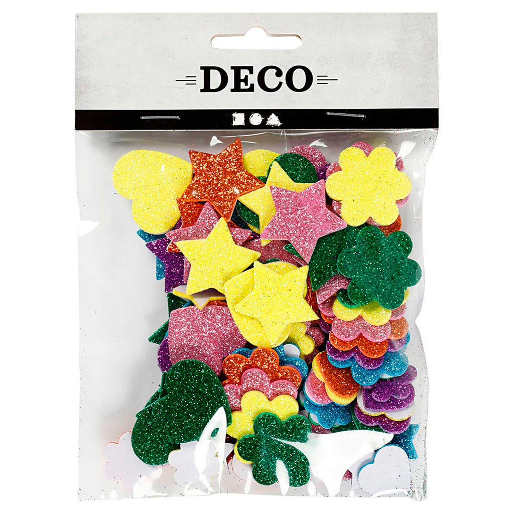Maak de mooiste creaties met deze set uitgestanste glitter figuren. De figuren zijn van zacht, foamachtig materiaal en hebben verschillende kleuren. De set bevat 100 figuren waaronder een ster, een bloem en een hartje. De afmetingen van de figuren variëren tussen 19 en 29 millimeter. De figuren zijn zelfklevend, lijm is dus niet nodig!