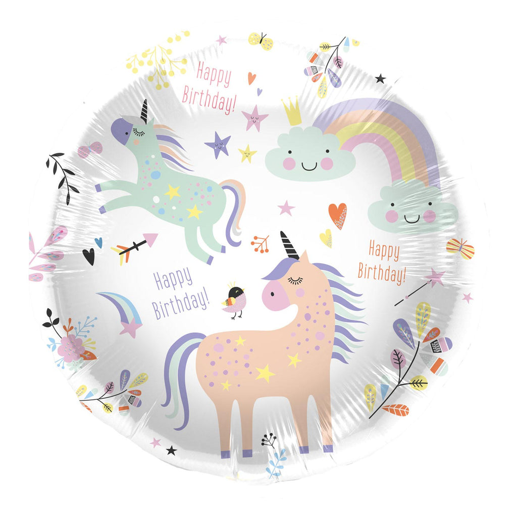 Deze grote folieballon heeft een prachtige unicornprint. Zowel als eenhoorn feestversiering te gebruiken, of om als verrassing cadeau te geven. Deze folieballon is 18 inch/45 centimeter groot.