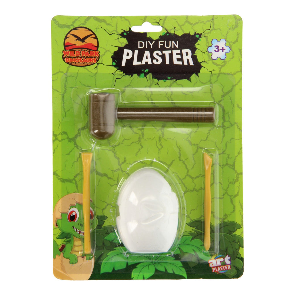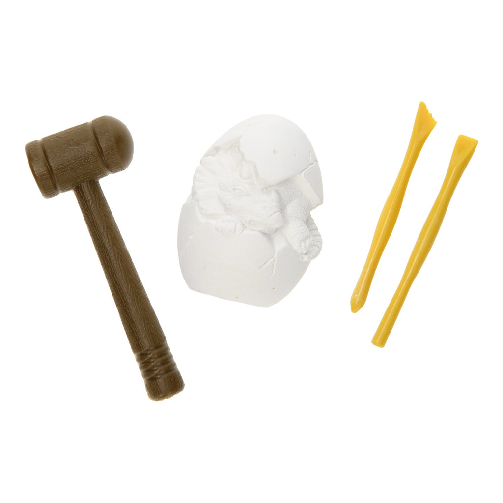 Haal de archeoloog in jezelf naar boven en hak de dinosaurus fossiel uit het gips! De hamer en de twee beitels zijn van kunststof, het ei is van gips. Gebruik de hamer en een beitel om de dino uit te hakken. Maar wees voorzichtig! Anders hak je misschien de dino kapot. De beitel is 9,5 cm, het ei heeft een doorsnede van 5 cm en is 7 cm hoog.