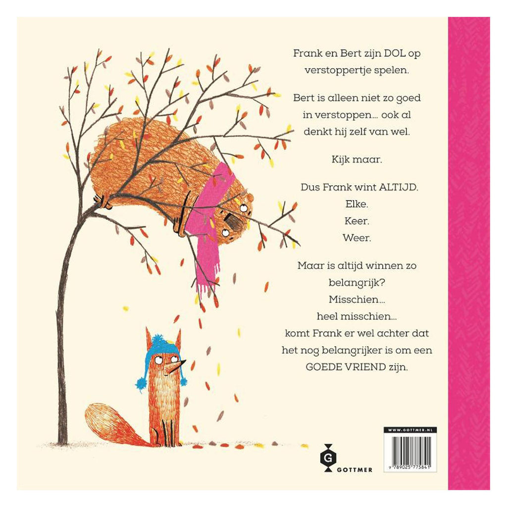 Frank en Bert' is een hartverwarmend - maar vooral grappig - prentenboek over de vrienden Bert de beer en Frank de vos. De slimme Frank spreekt de lezer op licht betweterige toon aan en vertelt ze liefdevol over zijn allerbeste maar beetje domme vriend Bert. Elke dag spelen de twee verstoppertje. Frank is er erg goed in, Bert... minder. De grote beer verstopt zich altijd wel achter een dun boompje of in een te kleine grot. Bert wil dolgraag winnen met verstoppertje spelen, maar het lukt hem nooit. Dus laat Frank, zoals het een goede vriend betaamt, Bert een keer winnen. Hij doet net alsof hij hem niet kan vinden. Nu Bert gewonnen heeft, mag hij Frank gaan zoeken. En die zal wel eens voordoen hoe je je echt goed moet verstoppen. Maar dan blijkt dat Bert zich misschien toch niet zo makkelijk laten foppen door zijn slimme vriend...