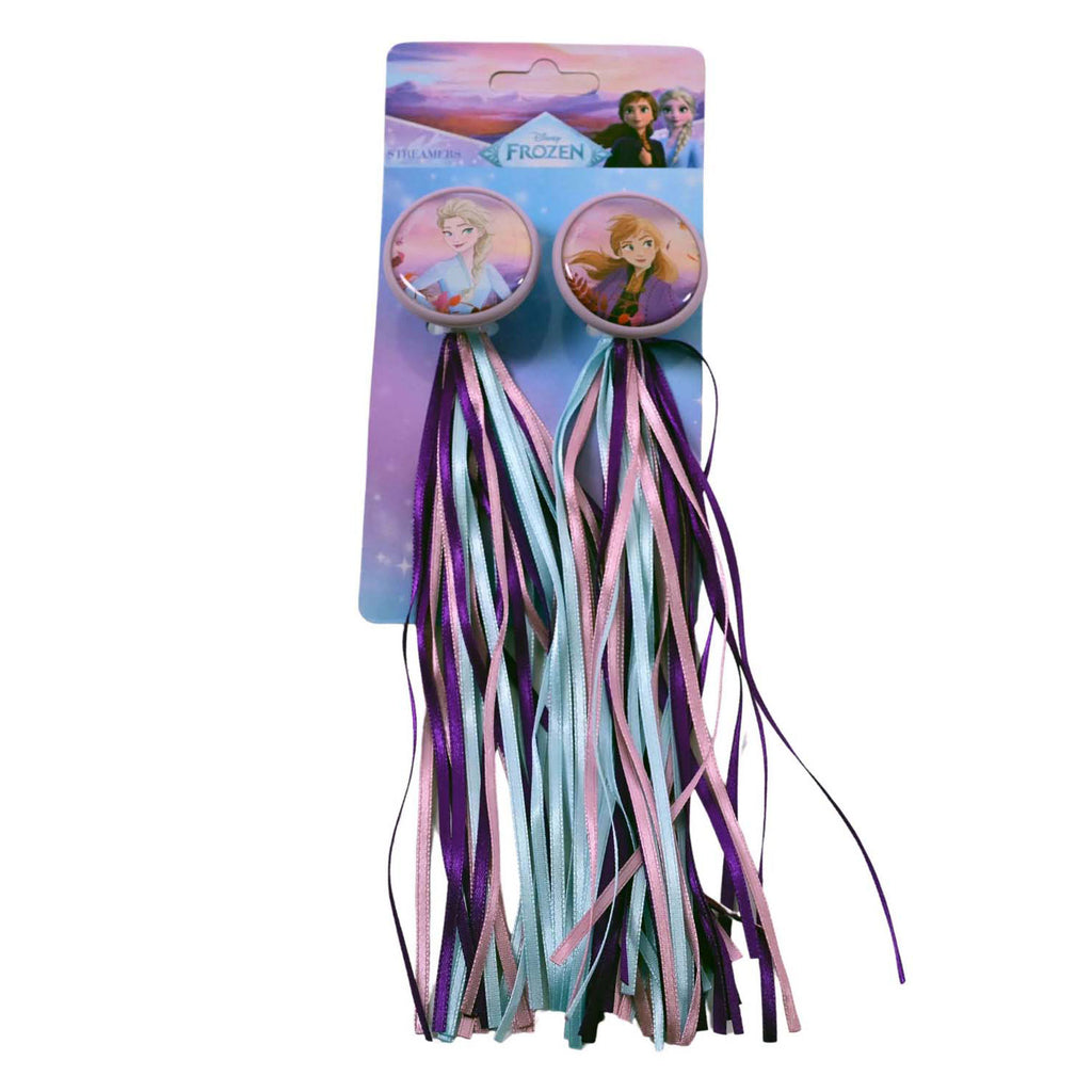 Laat je fiets stralen met deze Disney Frozen handvatversiering! De set bestaat uit kleurrijke, vrolijk wapperende slingertjes met een prachtige afbeelding van Anna en Elsa - perfect voor kleine Frozen-fans die hun fiets een magische touch willen geven.