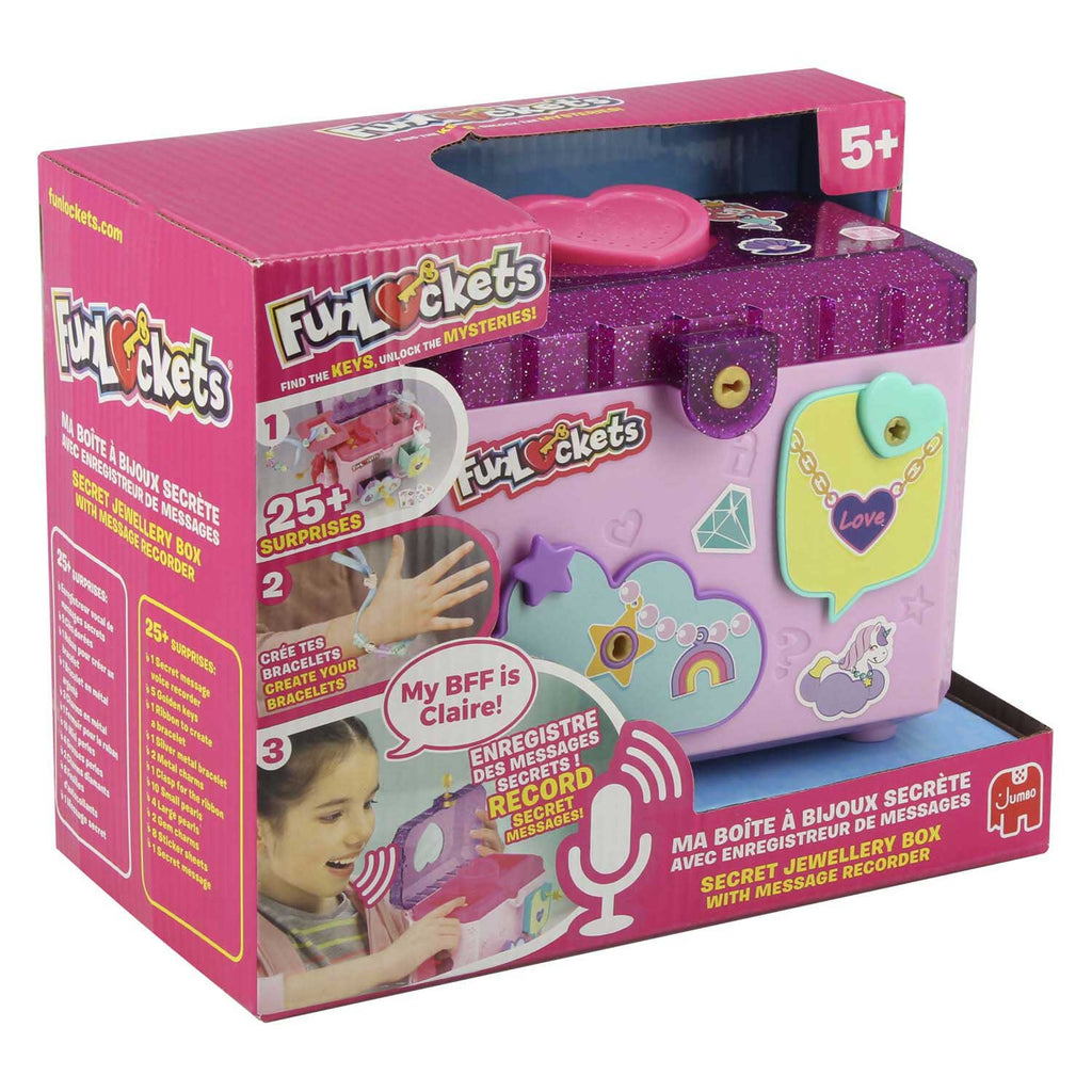Ontdek de geheimen van FunLockets! Vind de 5 gouden sleutels en open de vakjes vol verrassingen. Maak jouw eigen armbanden met meer dan 25 accessoires en versier alles met kleurrijke stickers. In het laatste vakje wacht iets heel speciaals: een stemrecorder waarmee je geheime berichten kunt opnemen! Wat zit erin? 1 stemrecorder voor geheime boodschappen 5 gouden sleutels 1 lint en 1 zilverkleurige armband 3 metalen bedels & 2 edelsteenbedels 10 kleine en 4 grote kralen 8 stickervellen 1 geheim bericht Vind de sleutels, ontdek de mysteries, maak, versier, draag én deel jouw creaties!