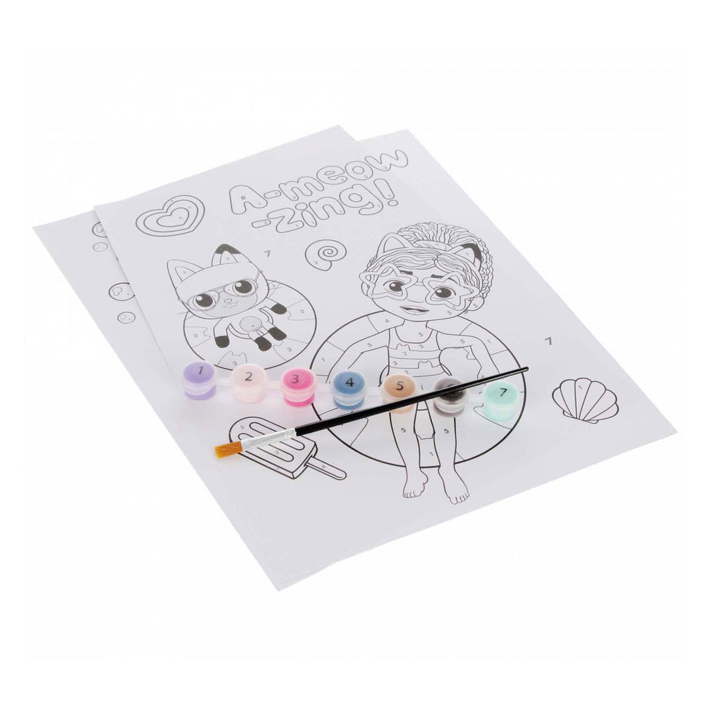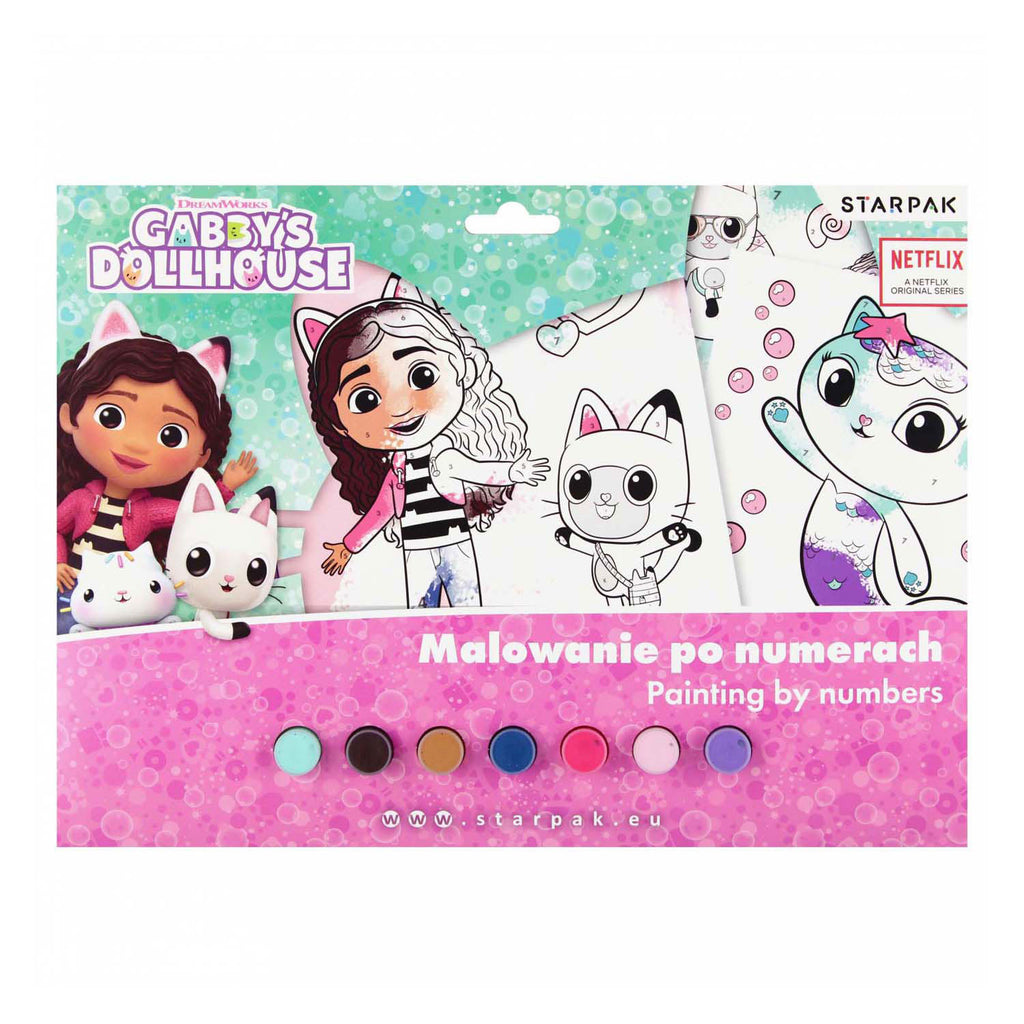 Deze Gabby's Poppenhuis schilderen op nummer set bevat 7 kleuren verf en een penseel. Het product is gemaakt van papier en kunststof. Geschikt voor kinderen vanaf 3 jaar oud.