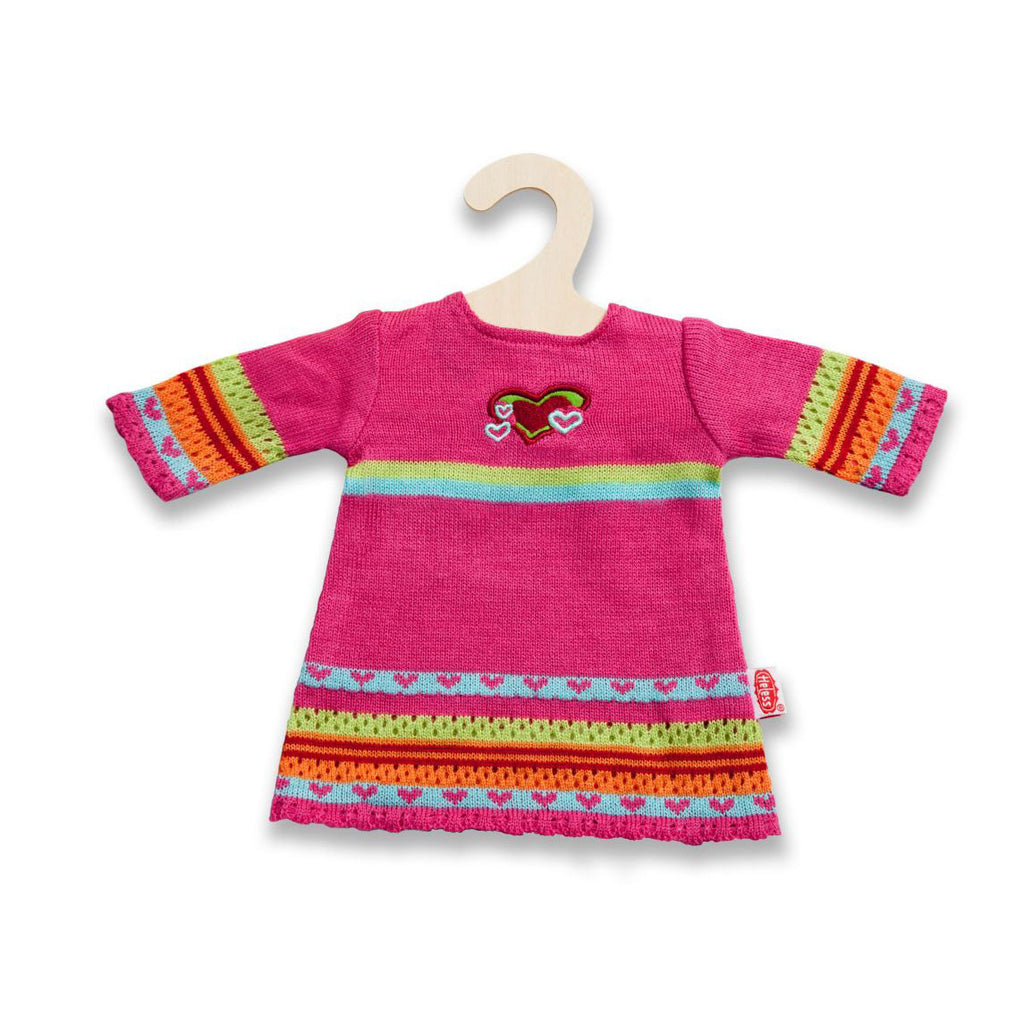 Kleurige gebreide poppenjurk met lange mouwen.