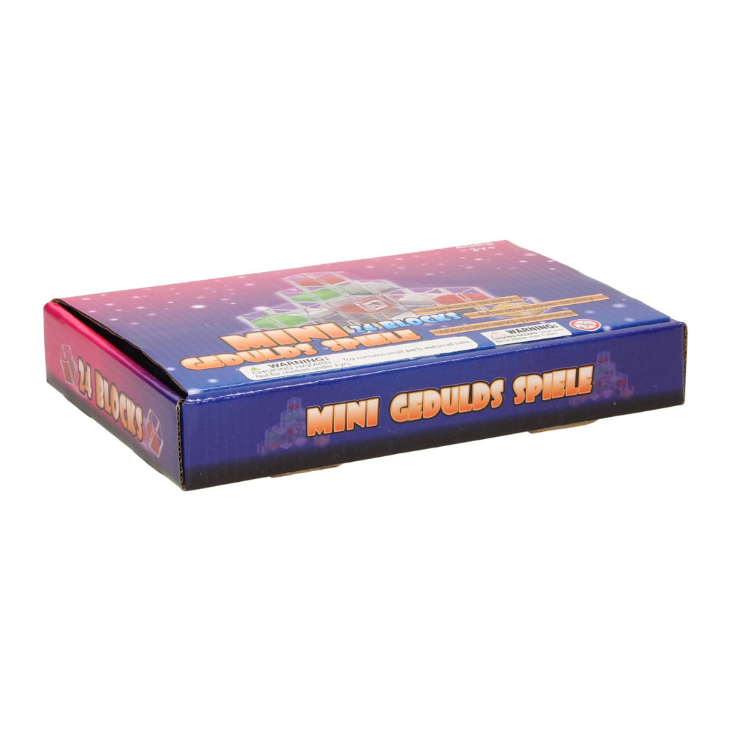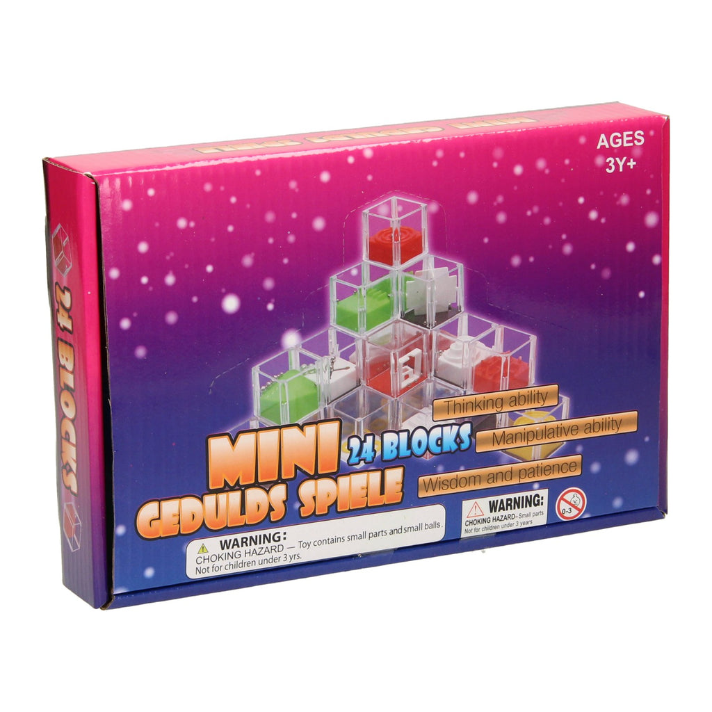 Set met 24 geduldspelletjes in de vorm van kubussen. In elke kubus zit een ander geduldspelletje. De kubussen hebben een afmeting van 4,7 x 4,7 x 4,7cm. De verpakking is 24 x 16 x 4 cm groot.