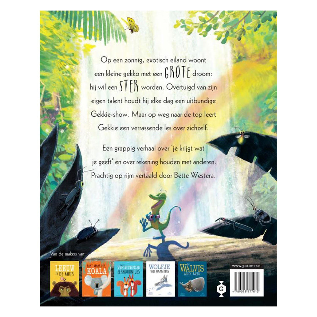 Gekkie de gekko wil niets liever dan een wereldster zijn. Op zijn exotische eiland houdt hij elke dag een grote Gekkie-show. Op een dag zijn de dieren het zat, maar Gekkie weigert te geloven dat hij geen ster is. Dan gaat hij liever weg! Hij vindt een grote kloof om in alle rust zijn lied te kwelen. Maar wat is dat voor afschuwelijk geluid dat daar terugkaatst?