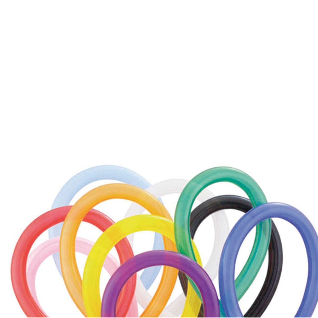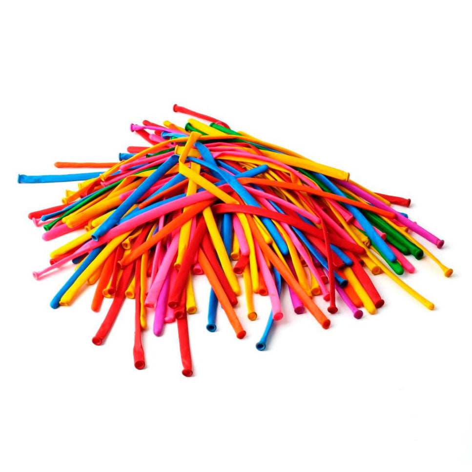 Set van 100 gekleurde modelleerballonnen. In diverse standaard kleuren zoals rood, geel, oranje, groen, blauw, roze, zwart, etc.
