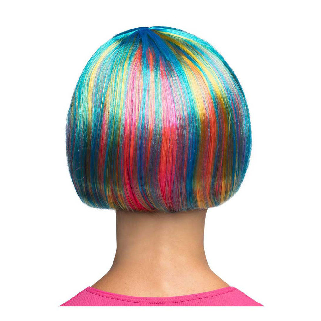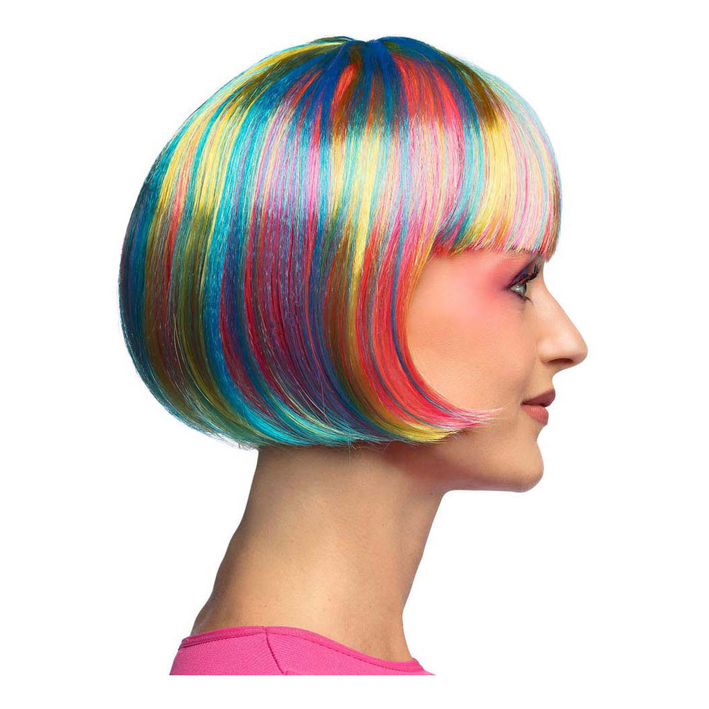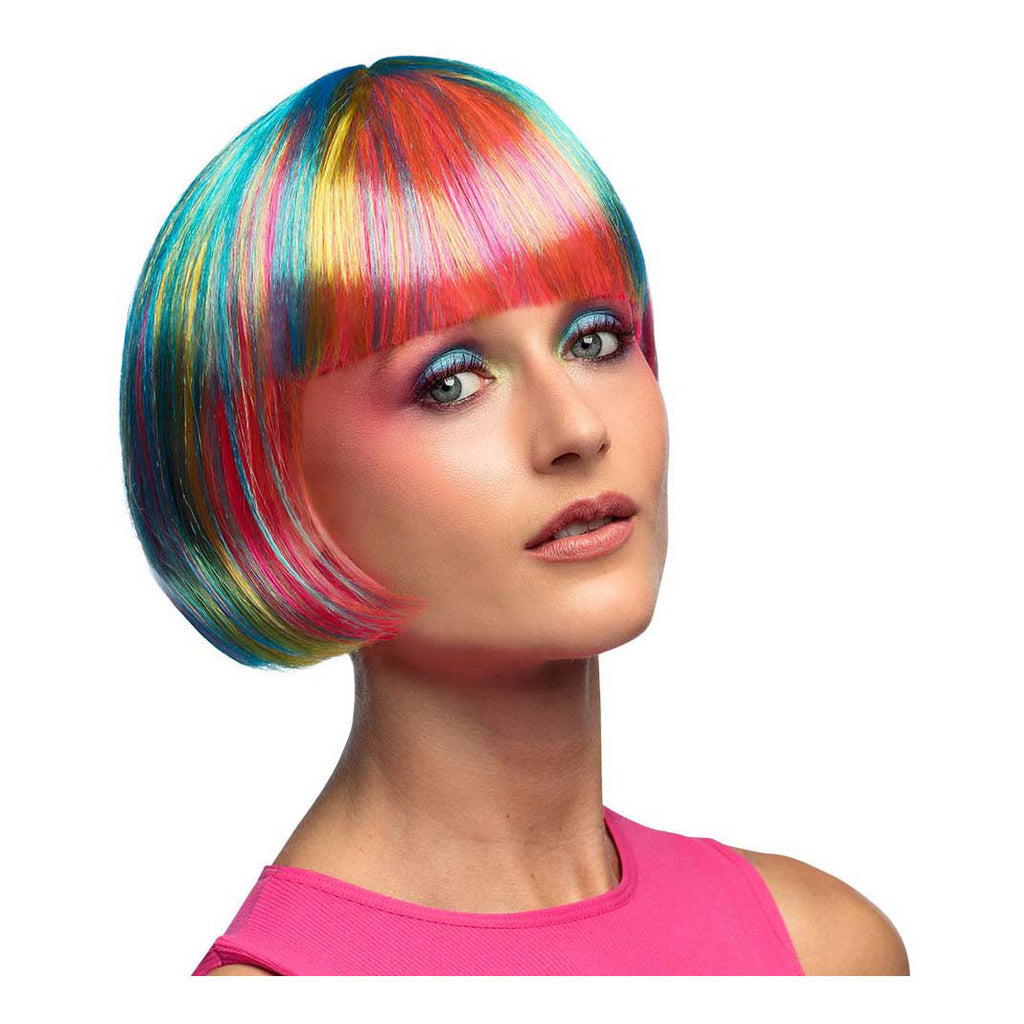 Korte, neonroze damespruik met steil haar en rechte pony, gemaakt van synthetisch materiaal. Geschikt voor volwassenen met een hoofdomtrek van circa 59 cm. Niet wasbaar en niet geschikt voor kinderen onder de 14 jaar.