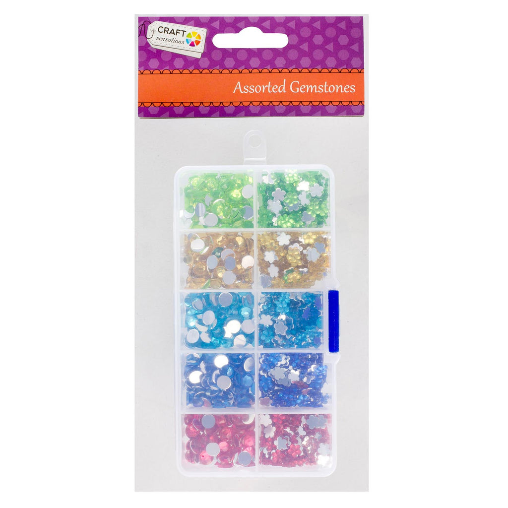 Opbergdoos met kunststof edelstenen in vijf verschillende kleuren.