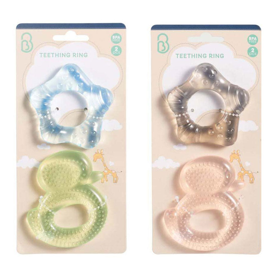 Set van 2 gel bijtringen met verschillende structuren. Koelbaar in de koelkast. Gemaakt van BPA-vrij kunststof. Geschikt vanaf 2 maanden.