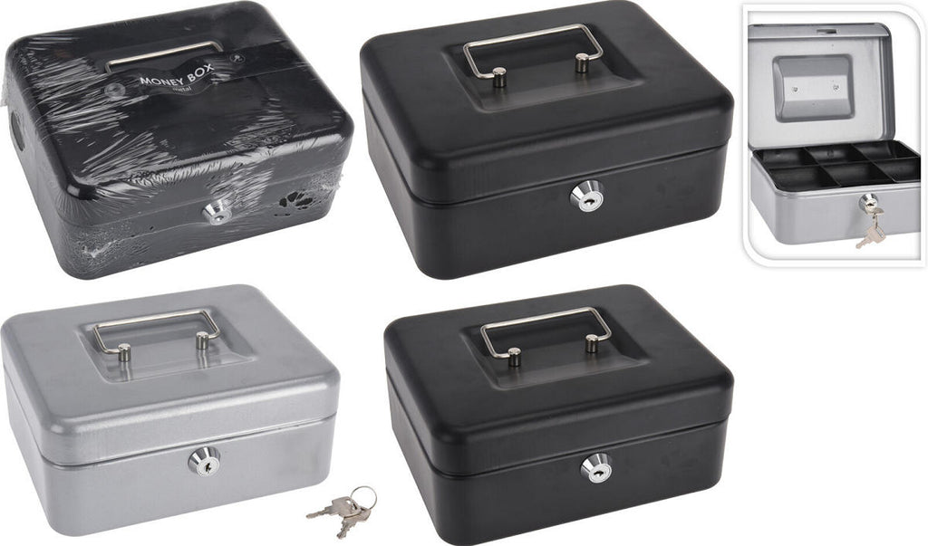 Metalen geldkisje met slot en twee sleutels. Afmeitngen: 20 x 16 x 9 centimeter.