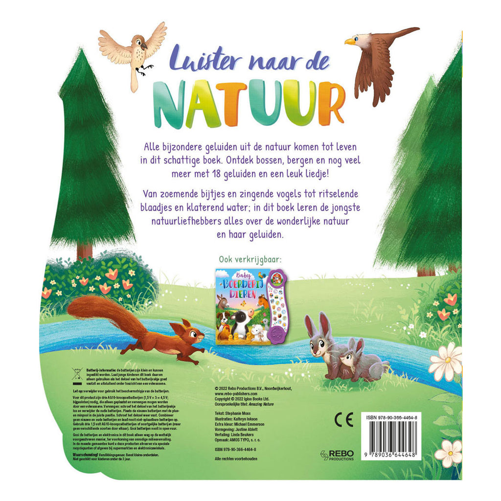 Alle bijzondere geluiden uit de natuur komen tot leven in dit schattige boek. Ontdek bossen, bergen en nog veel meer met 18 geluiden en een leuk liedje! Van zoemende bijtjes en zingende vogels tot ritselende blaadjes en klaterend water; in dit boek leren de jongste natuurliefhebbers alles over de wonderlijke natuur en haar geluiden.