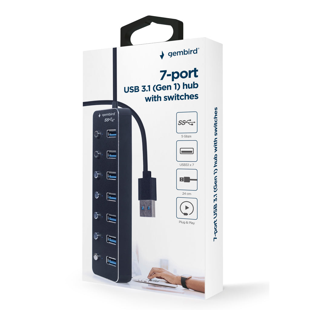 - 7 poorts USB 3.1 hub met schakelaars en netstroomvoeding