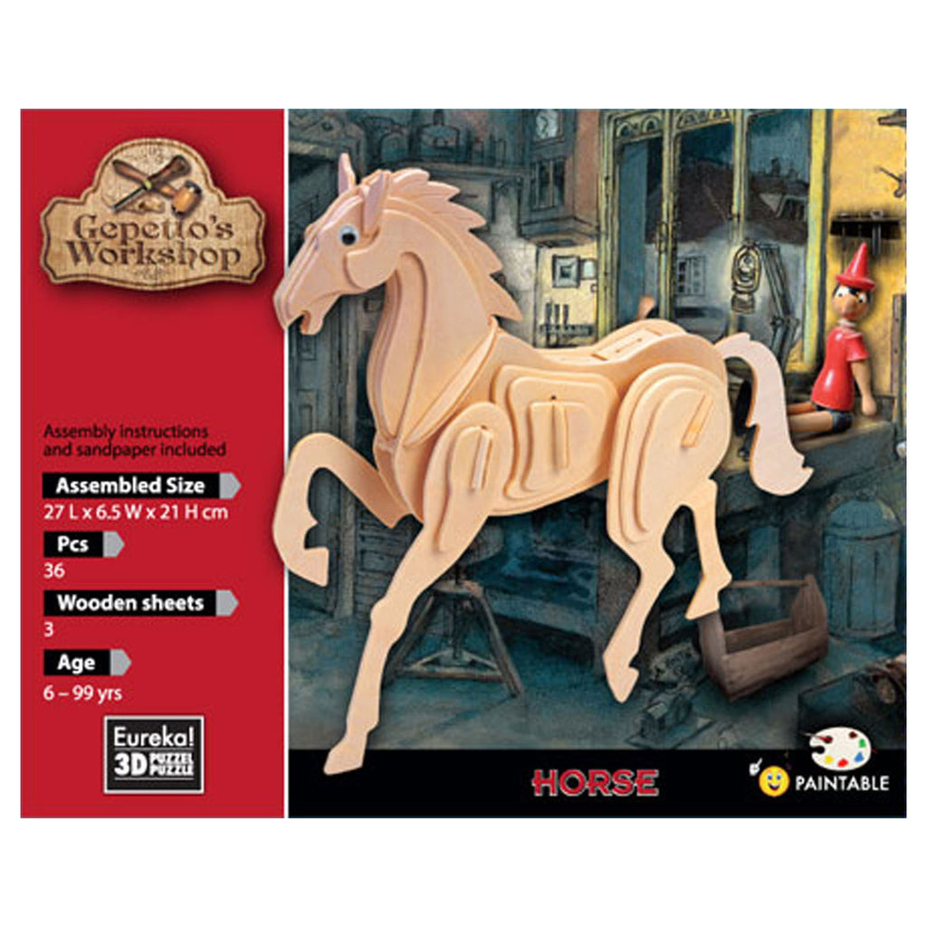Bouwpakket van houten paard met 36 onderdelen, formaat 27 x 6,5 x 21 cm, inclusief instructie.