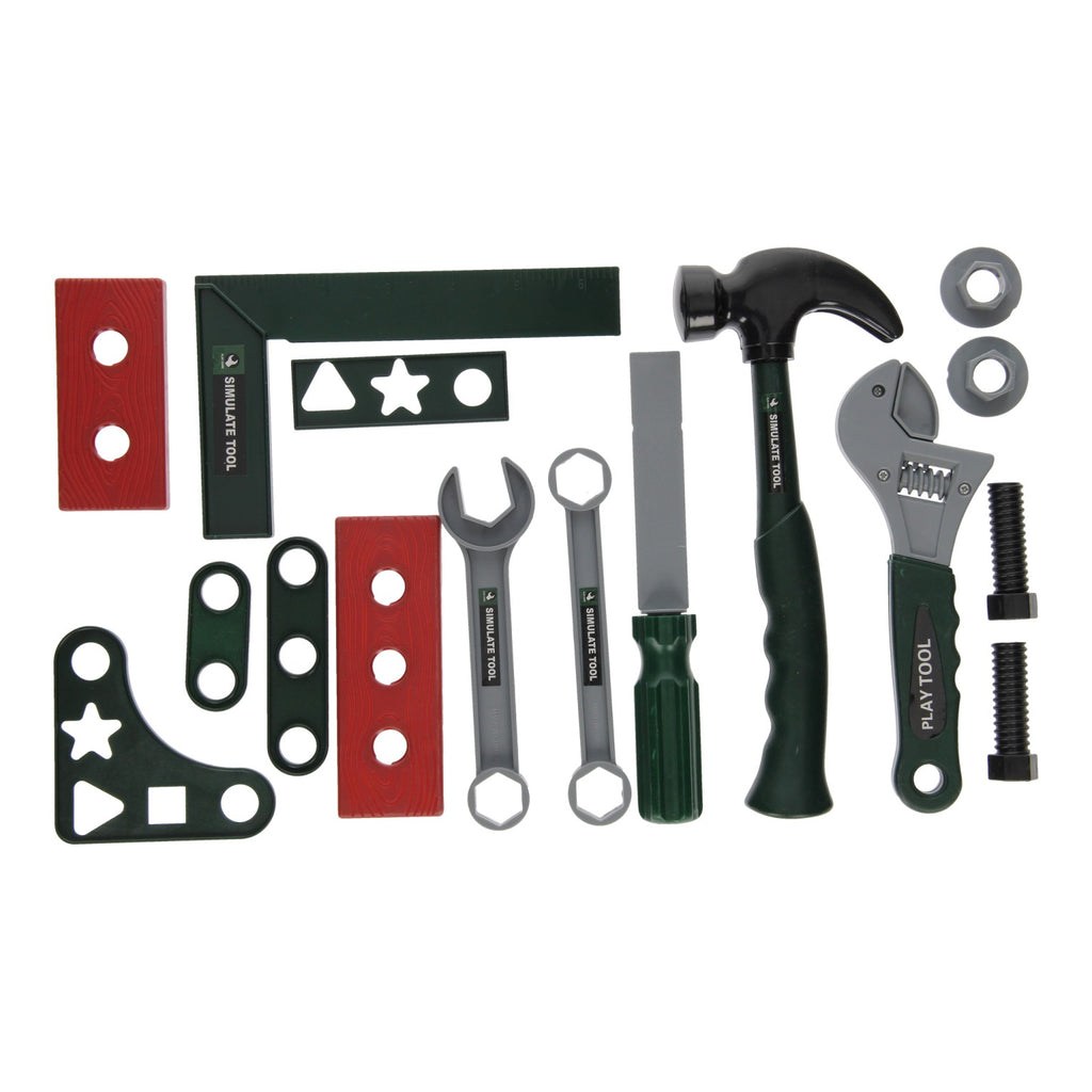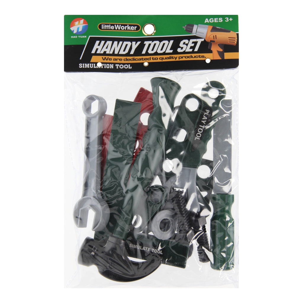 Met deze gereedschapset heeft de kleine klusser alles bij de hand voor zijn klus. In de set zit o.a. een hamer, vijl, (verstelbare) moersleutel en een aantal bouten. Het gereedschap is gemaakt van stevig kunststof en heeft donkergroene handvatten.