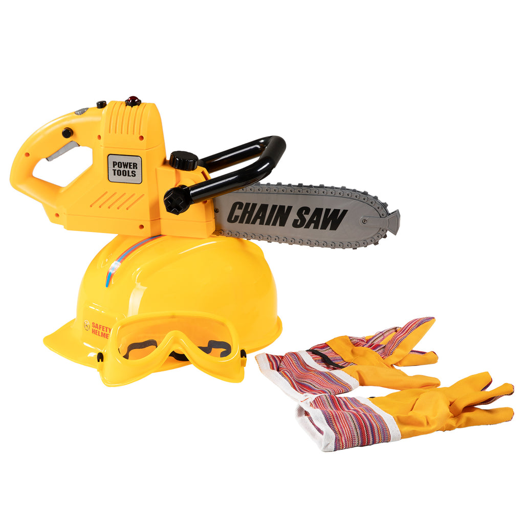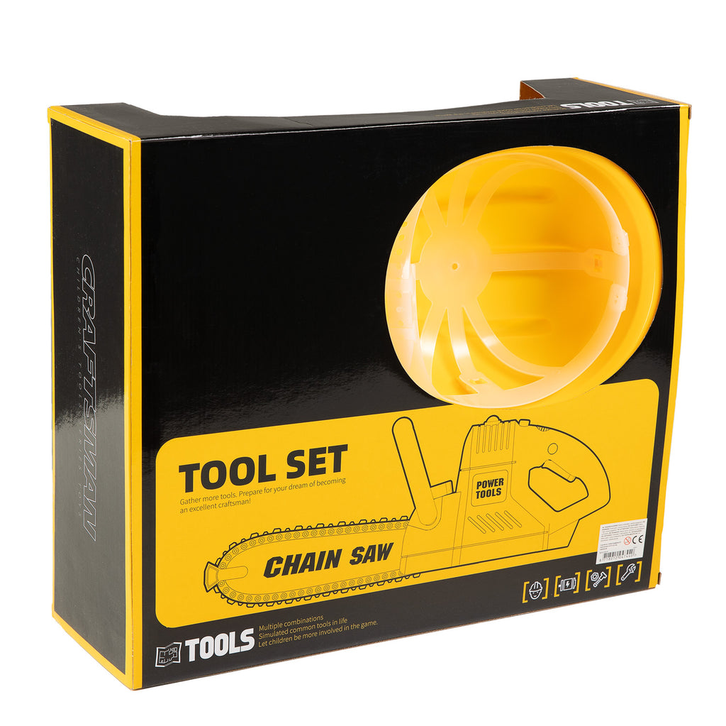 Speelgoed gereedschapsset bestaande uit een kettingzaag inclusief geluid & lichten, handschoenen, een helm en een veiligheidsbril. Geschikt voor kinderen vanaf 3 jaar.