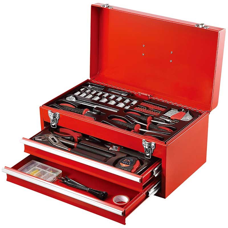 - De metalen opbergkist bevat een uitgebreid assortiment met veel voorkomende gereedschappen en ijzerwaren: